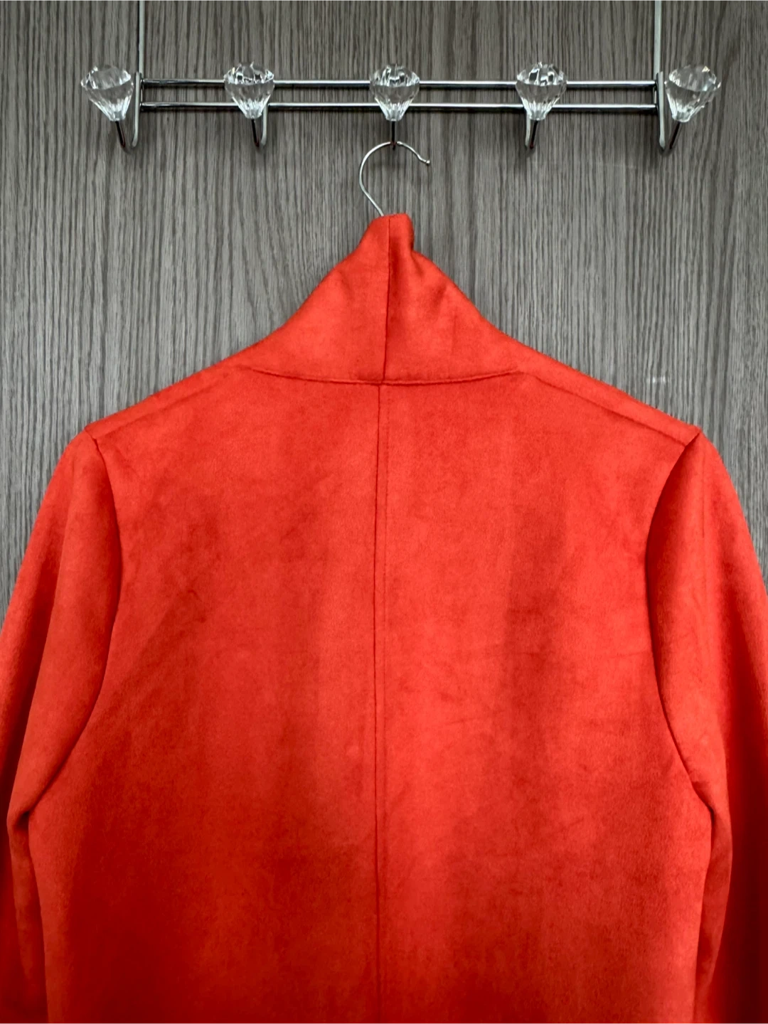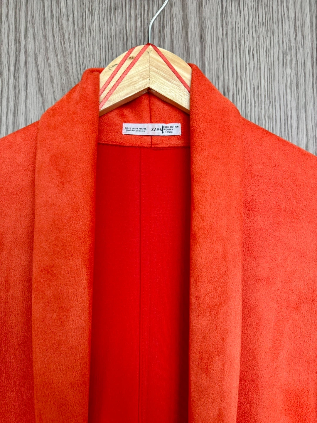 A beautifully vibrant ZARA Collection suede-effect open-front duster coat in a rich red/coral tone. This lightweight yet structured piece features: