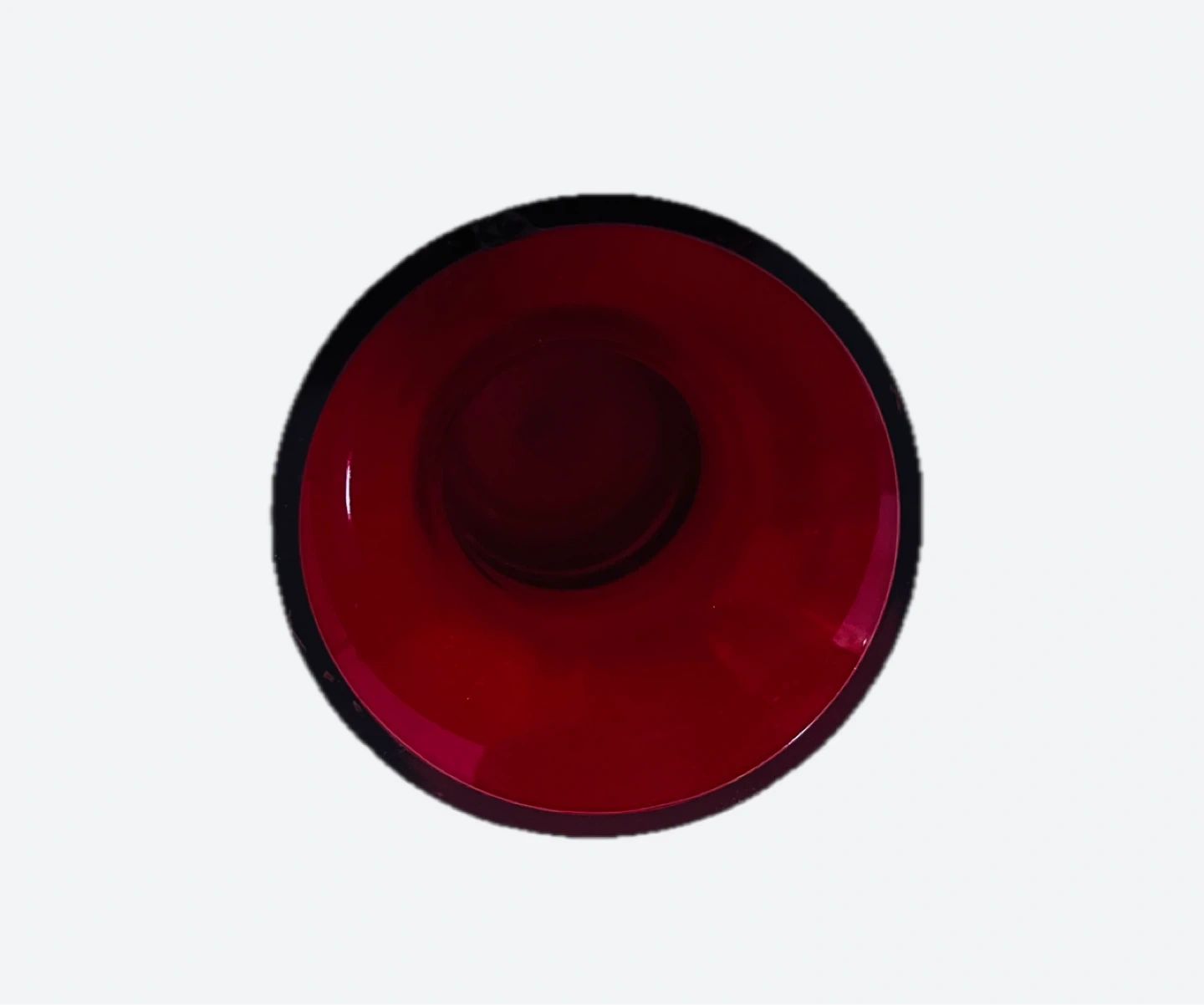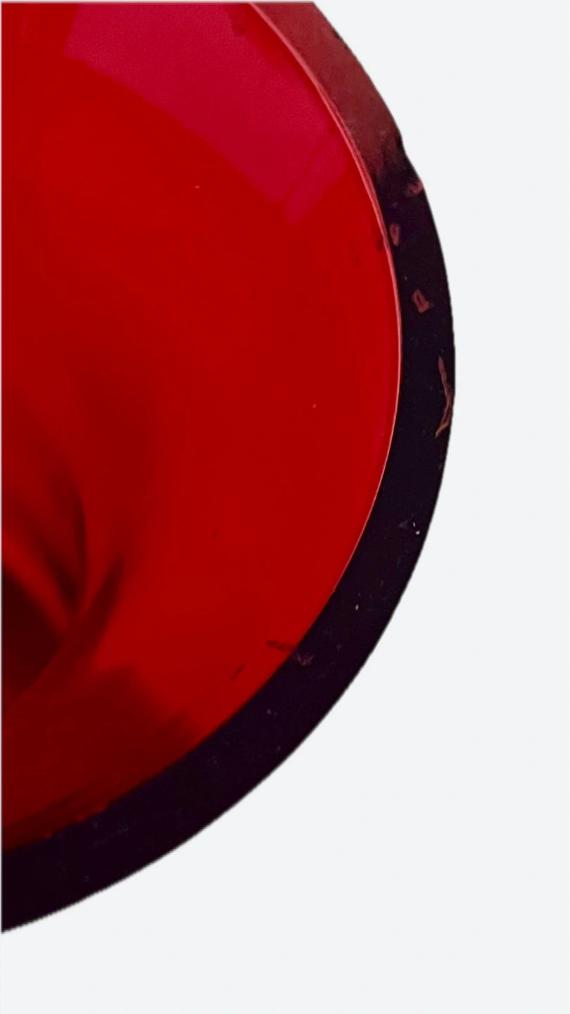 A lovely vintage red glass vase that would look great with any flower arrangement. The vase has a sleek design and is perfect for adding a pop of colour to your home decor. There are some minor scratches on the rim due to vintage condition.