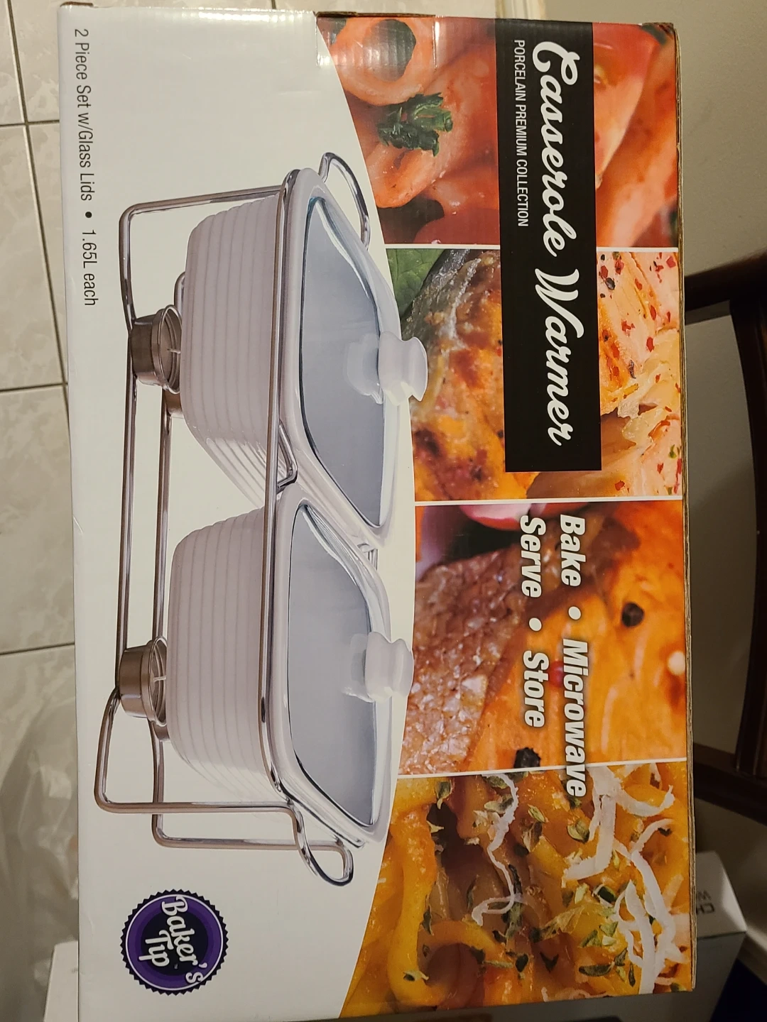Selling a brand new Baker's Tip Casserole Warmer! It's a porcelain premium collection and comes in the original box. This 2-piece set includes glass lids, each with a 1.68L capacity. Perfect for baking, serving, storing, and microwaving your favourite casseroles