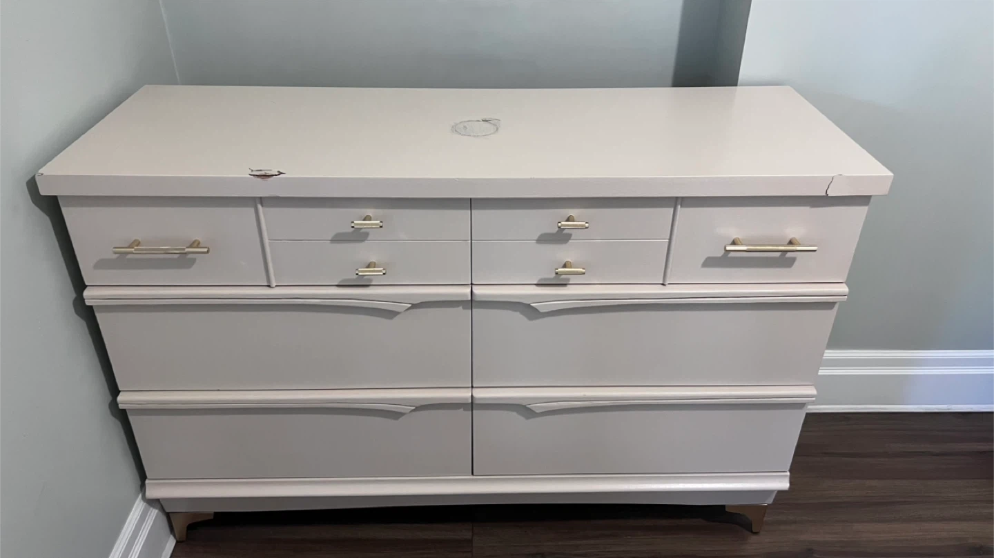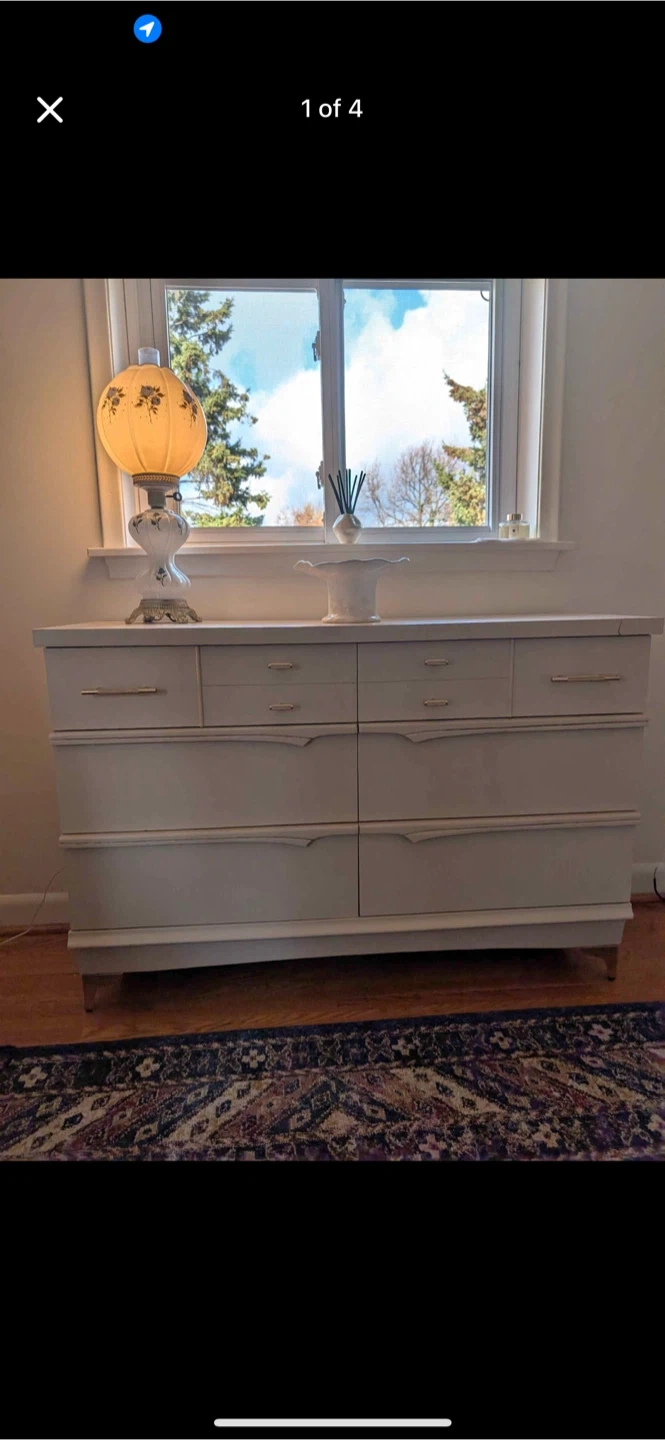 Selling a vintage dresser with a cream finish and gold handles. This antique dresser has been professionally refinished but has some signs of use on the top (a cup ring and two nicks from moving the item). Other than the top it’s in perfect condition everywhere else. Drawers are lined and offer plenty of storage space for your clothes and other belongings.