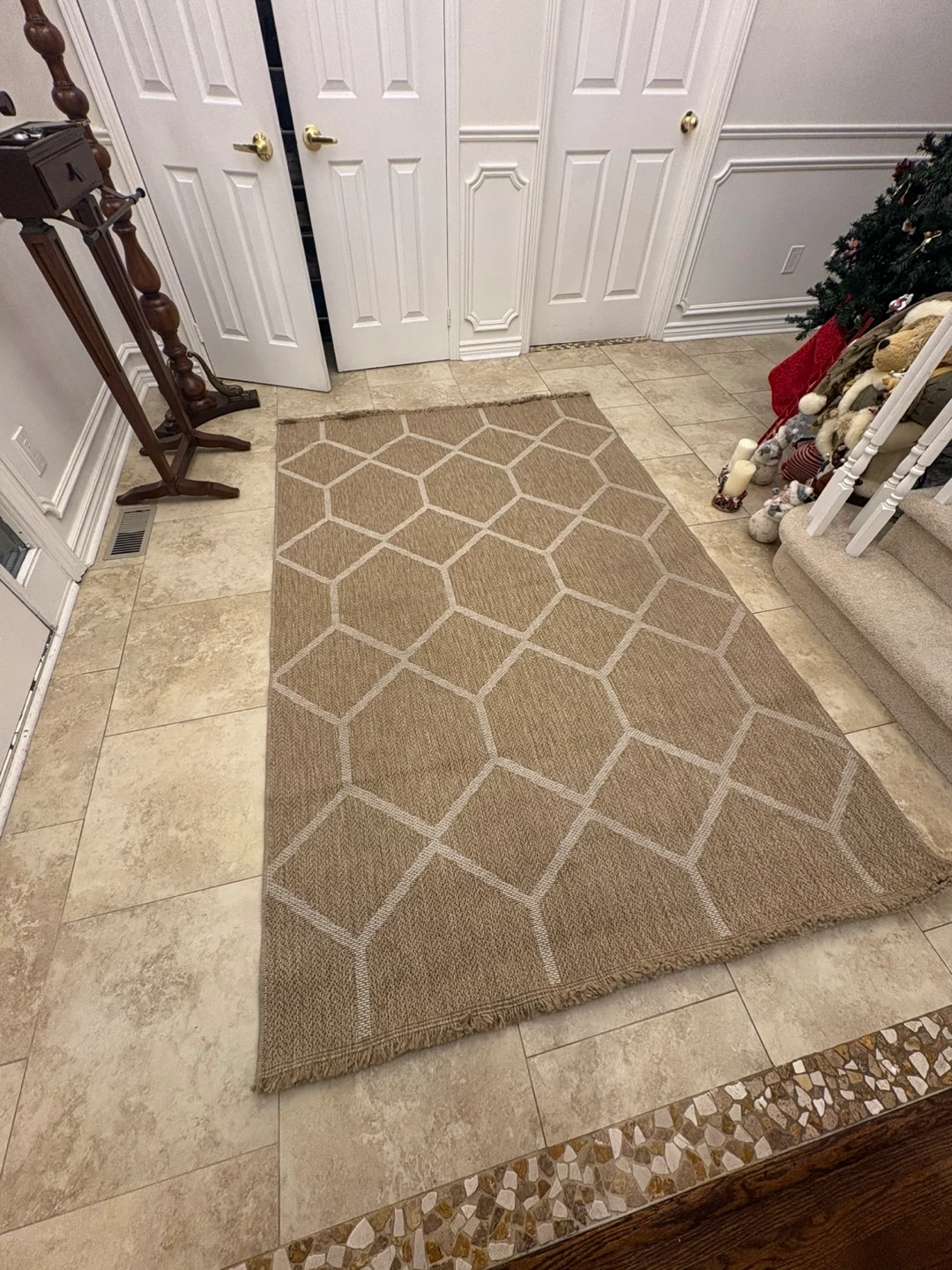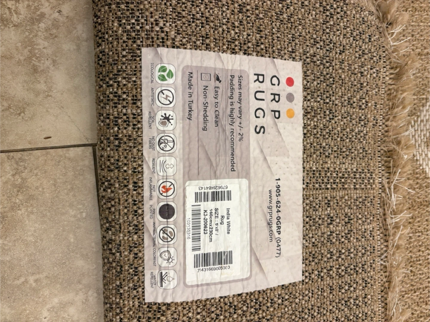 Selling a GRP Rugs India White rug. The size is 160cm x 230cm. It's easy to clean and non-shedding. The padding is highly recommended