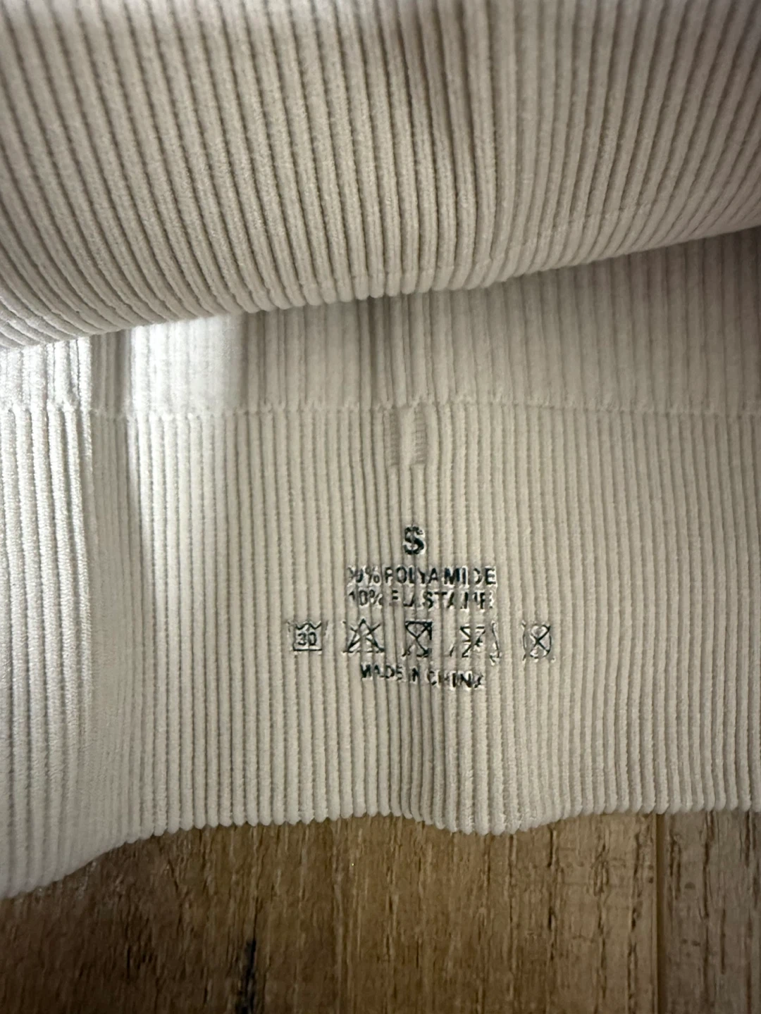 Selling a comfy white ribbed sports bra in size small! The material is 90% polyamide and 10% elastane, making it stretchy and breathable. From SHEIN. Size small.