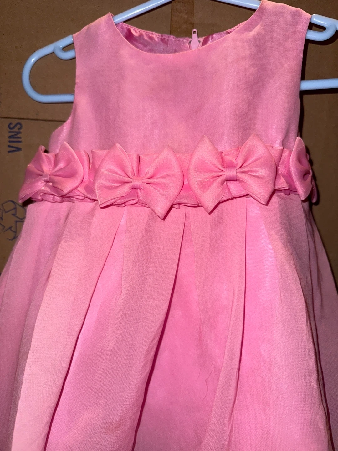 A cute pink dress perfect for parties or special occasions! It features lovely bow details around the waist. It's in great condition and ready for a new home