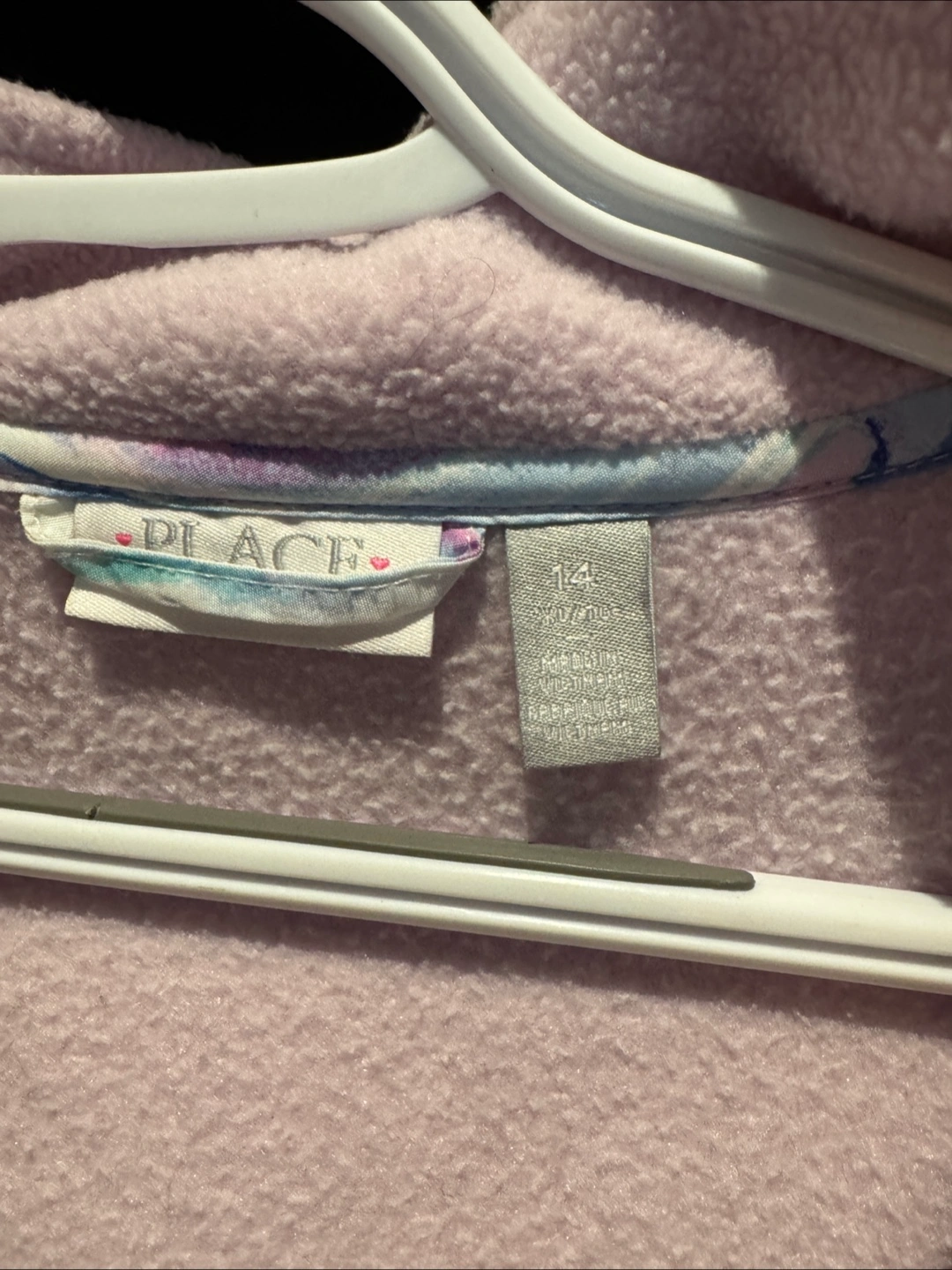 It's a size 14 and features a beautiful, swirly blue, pink, and white pattern on the outside and a soft, lilac-coloured fleece lining on the inside which can be used separately.