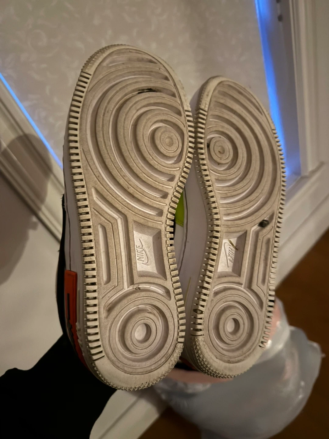 Selling a pair of Nike Air Force 1 Shadow women's sneakers! They have a unique layered design and are super comfy. The shoes feature a mix of colours, including white, black, blue, orange, and a vibrant neon green. Great for adding a pop of colour to your outfit!