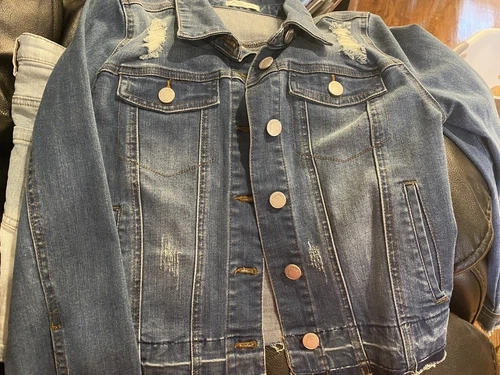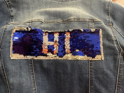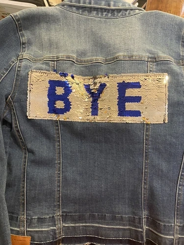 Pinc Premium denim jacket girls size L fits like 12 I’d say maybe even 12-14 Sequin Back Accents - 2 styles up is HI down is BYE Color if the sign changes between silver and blue Very nice fancy jacket button down front Retail $98