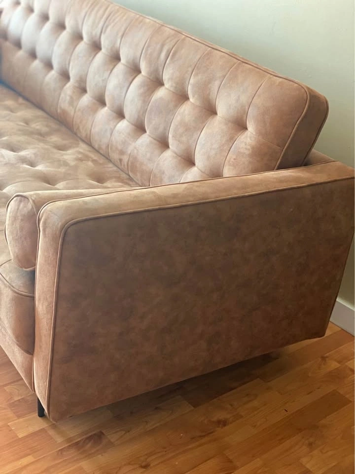 4 years of use. Sturdily constructed from solid wood, this fabric sofa sits atop black metal legs with non-marking foot pins. Available in Brown.
