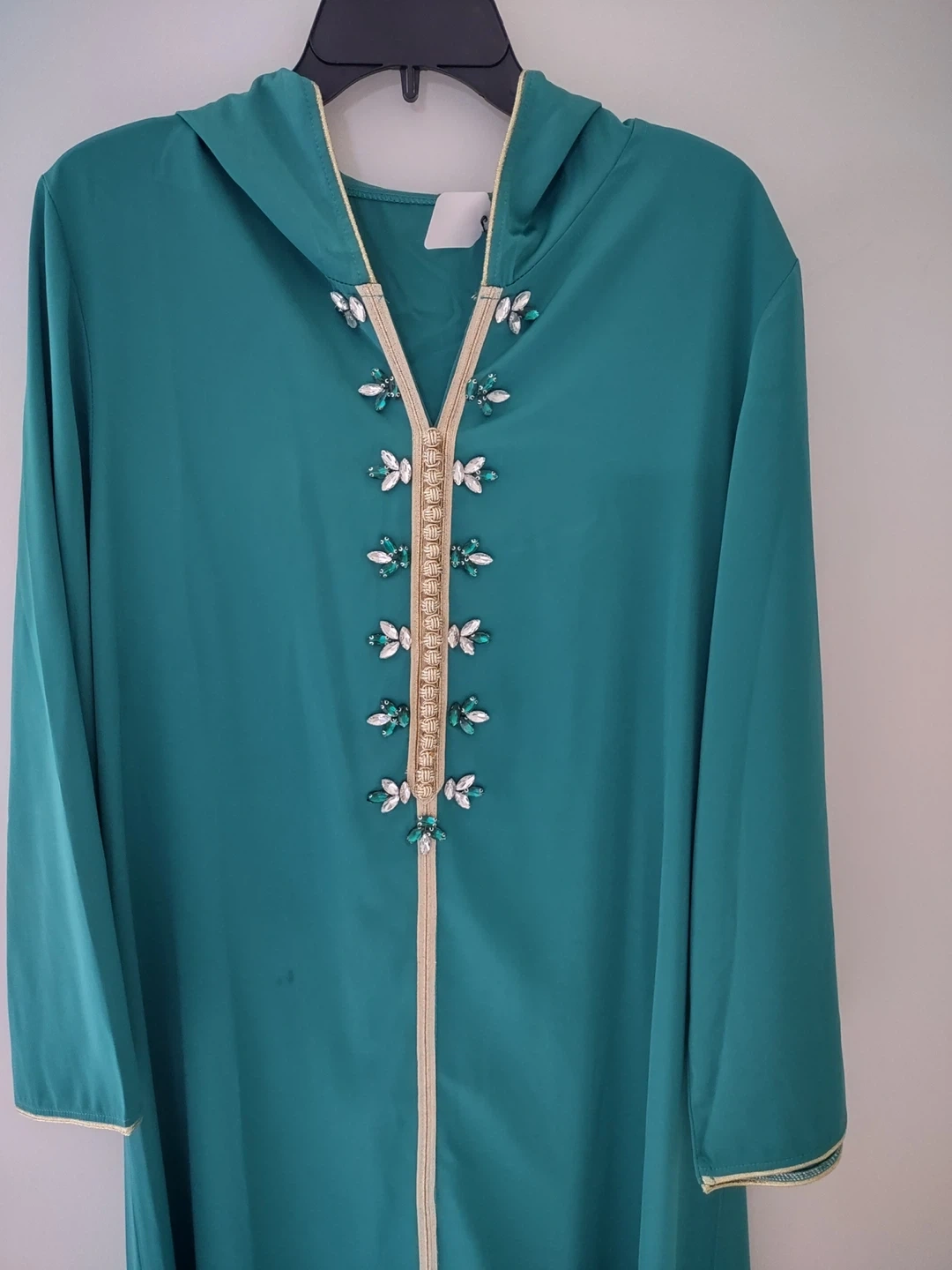 Beautiful green Moroccan kaftan with intricate detailing. It's in great condition and ready for a new home! Perfect for special occasions or adding a touch of elegance to your wardrobe