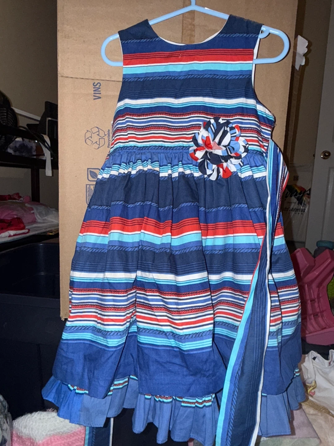 Cute striped dress with a flower detail. Perfect for a special occasion or just a fun day out! The dress features a blue, white, and red stripe pattern with a matching sash. It's in great condition and ready for a new home