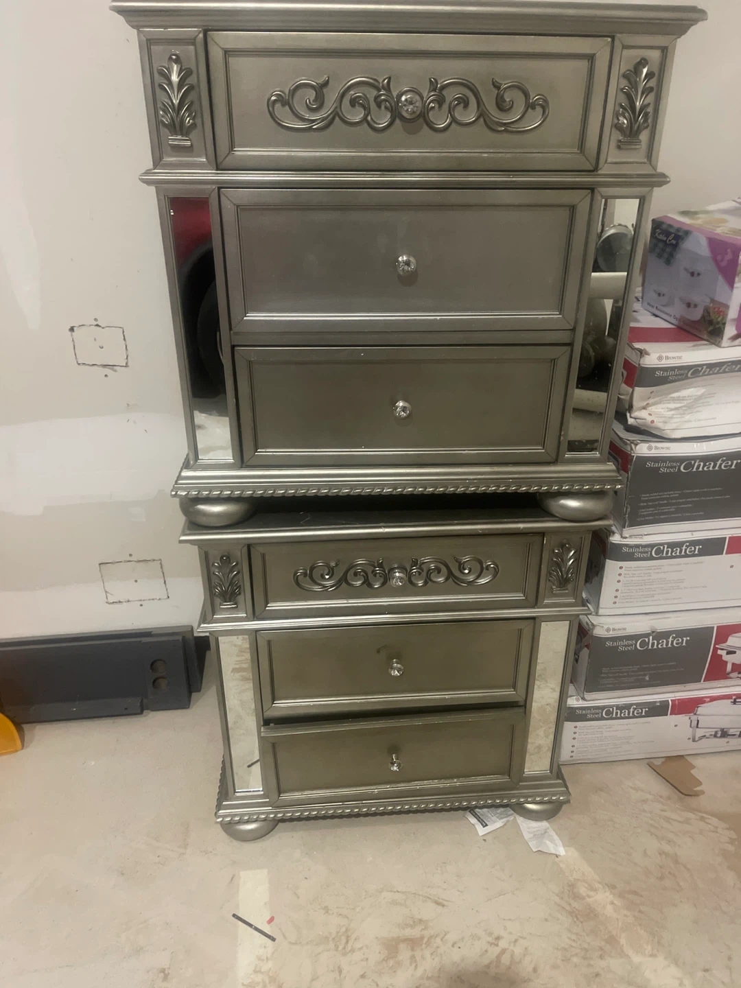 Selling a dresser set with mirror accents! It's a beautiful piece that could add a touch of elegance to any bedroom. The set includes two dressers, one of which is a larger dresser with multiple drawers. It's in good condition and ready for a new home!
