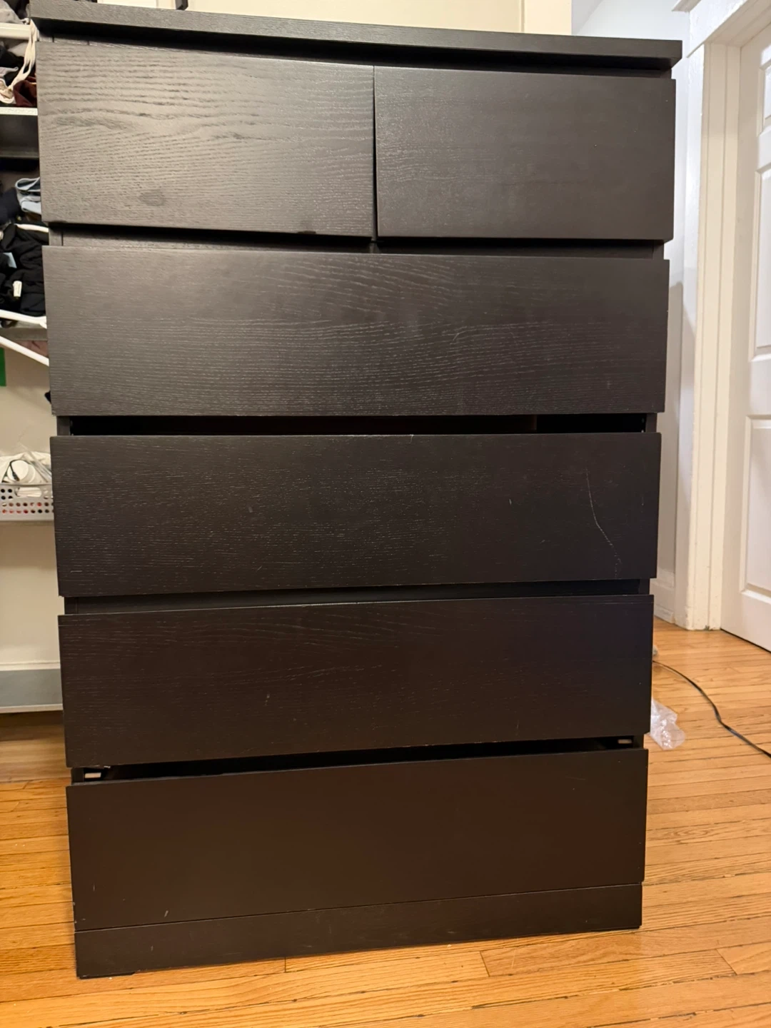 Selling a used IKEA Hemnes 6-drawer dresser in black-brown. It's a great piece for adding storage to any bedroom. Has a few signs of use, but overall in good condition.