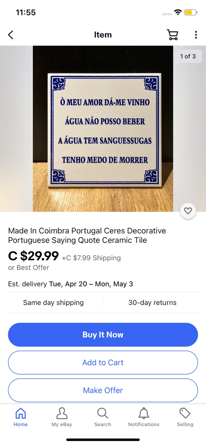 Hi I’m selling lovely Portuguese Quoted tiles. I can sell the (PAIR for $20) or (EACH $12). There’s an eBay listing for price reference comparison. Msg me if interested.