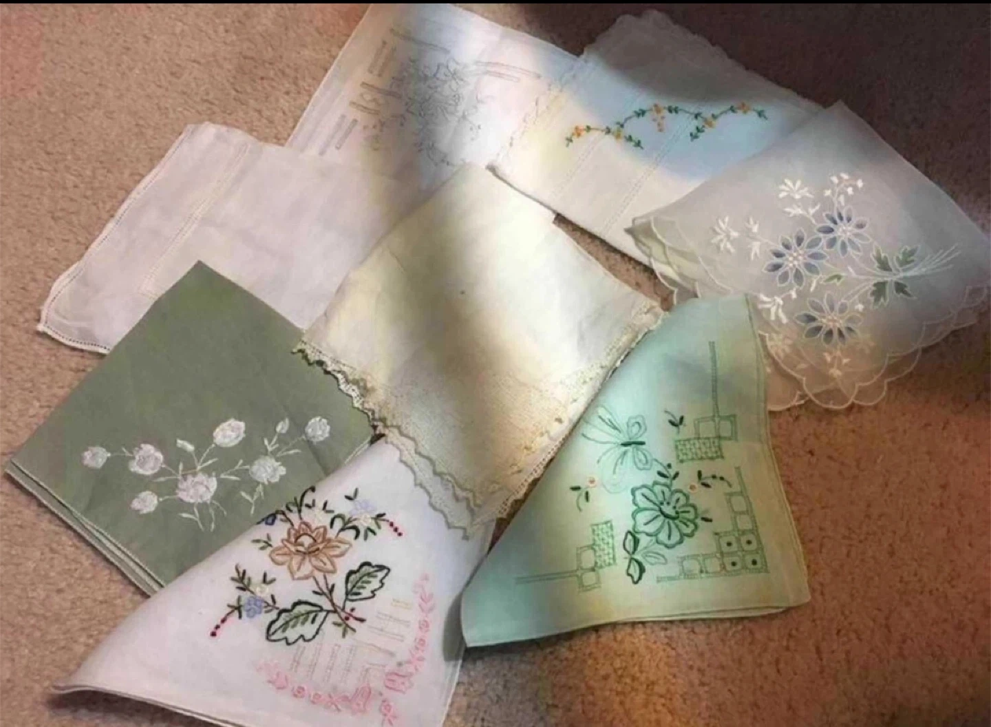 Set of 8 vintage embroidered hankies. They feature delicate floral designs and are in good condition. These are perfect for adding a touch of vintage charm to your collection or for use as decorative accents