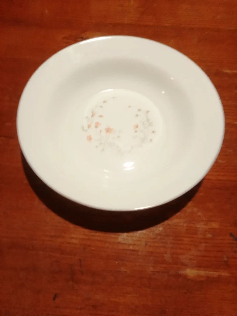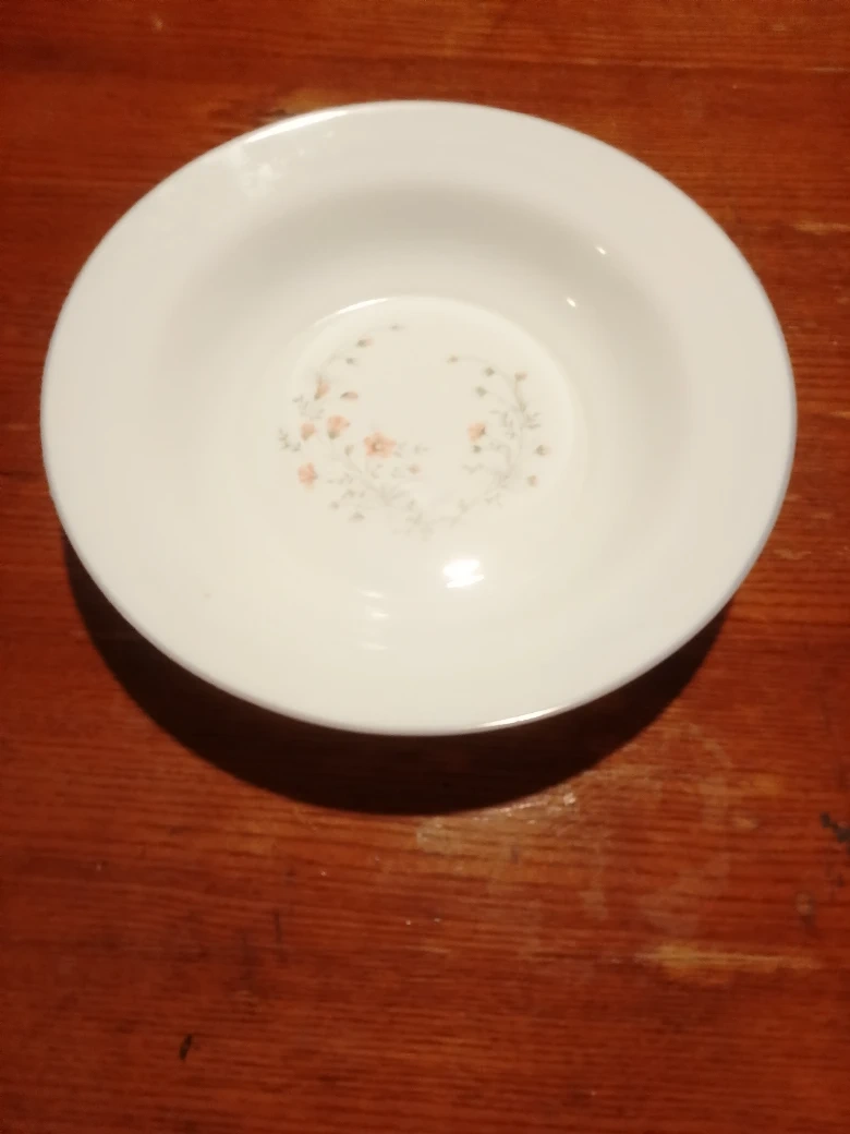 Here's a lovely white bowl with a delicate floral pattern in the centre. It's in great shape and perfect for everyday use or as a decorative piece for your table