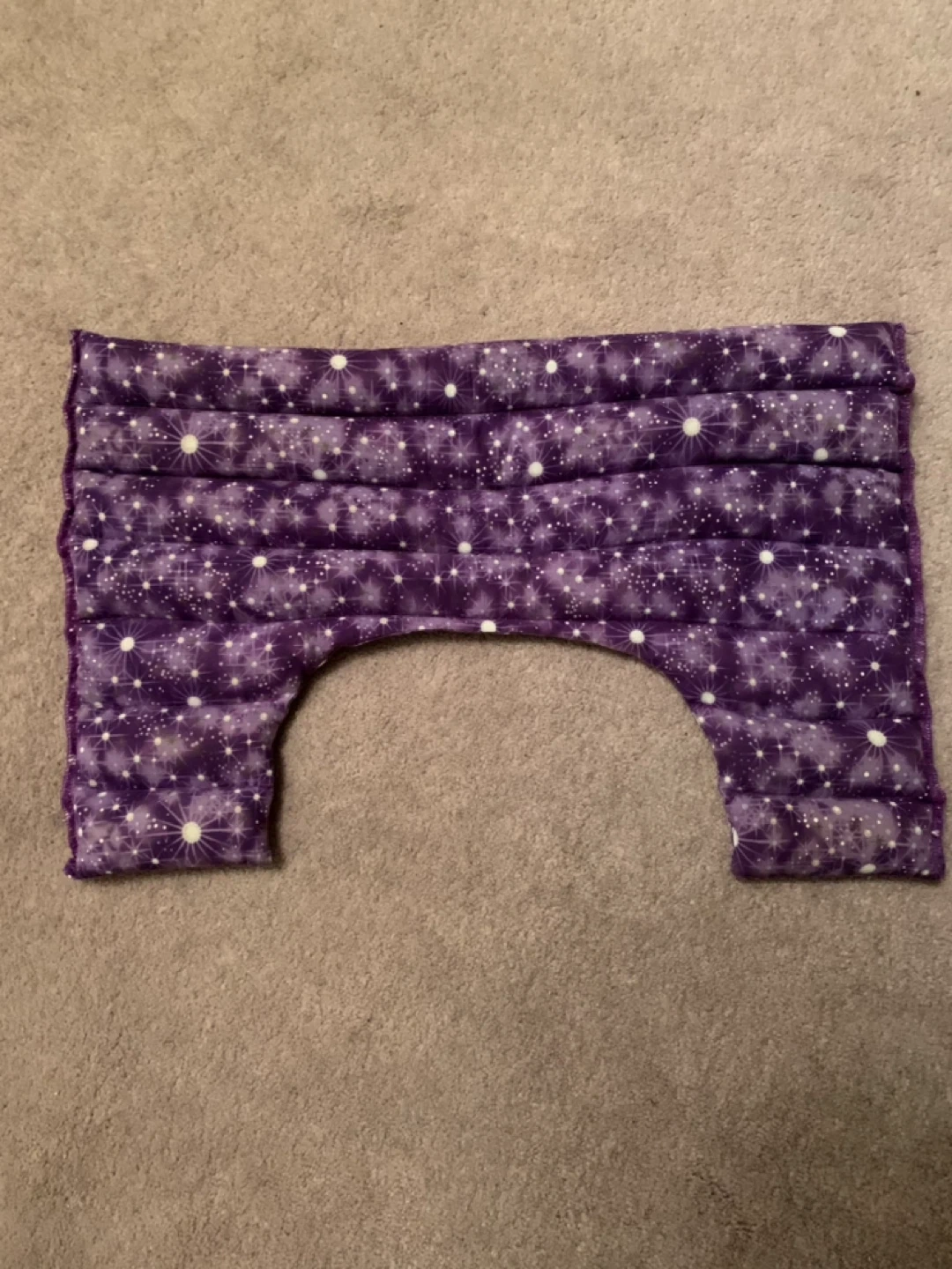 Keep your neck and shoulders cozy with this Nature Creation wrap! It's purple with a star pattern and measures approximately 19 inches wide and 11 inches long. It is made of flaxseeds and has a lavender aroma. For microwave or freezer this works great for any aches or pains. And the smell of lavender sets a calming effect.