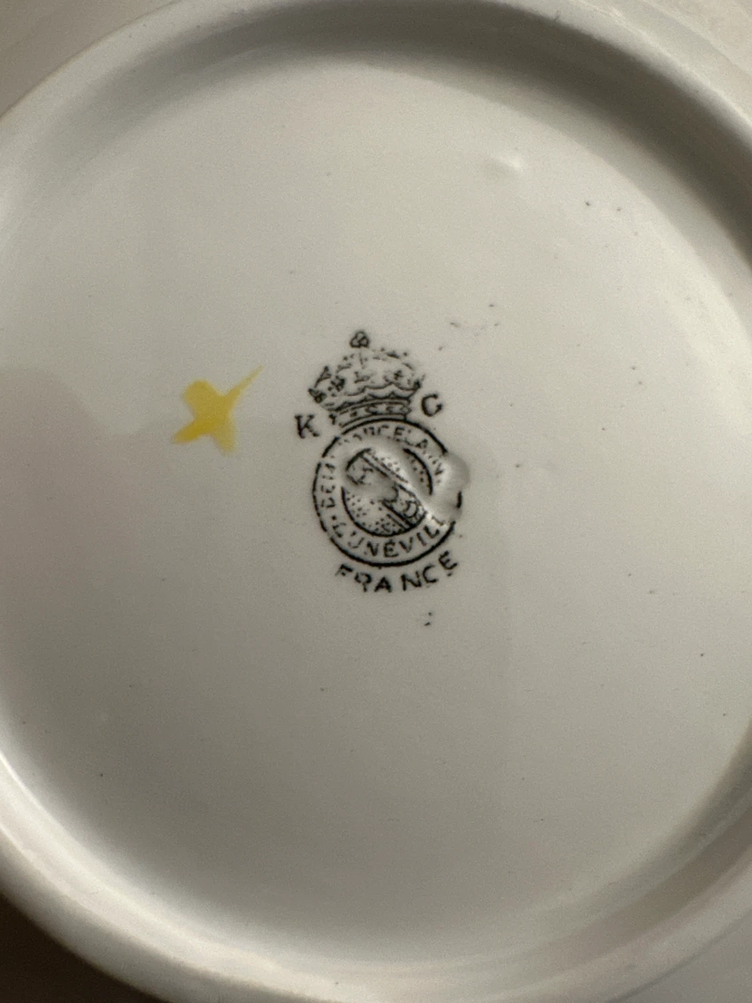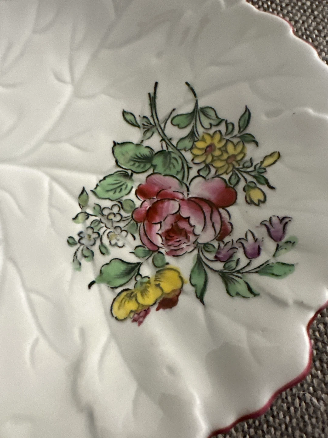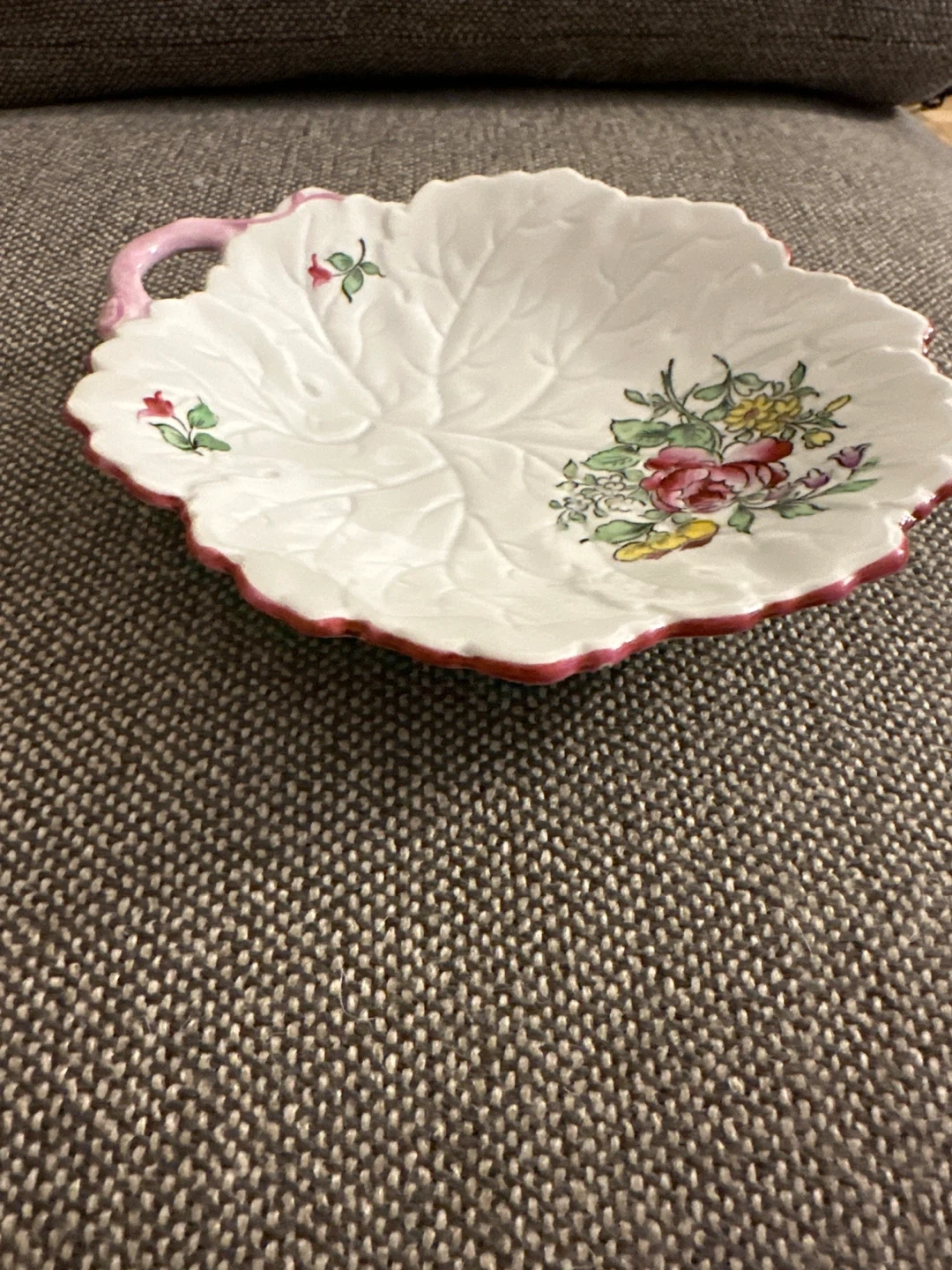 Selling a charming K&C Lunéville France leaf-shaped dish! It features a delicate floral design and a cute pink handle. Perfect for adding a touch of vintage elegance to your home decor