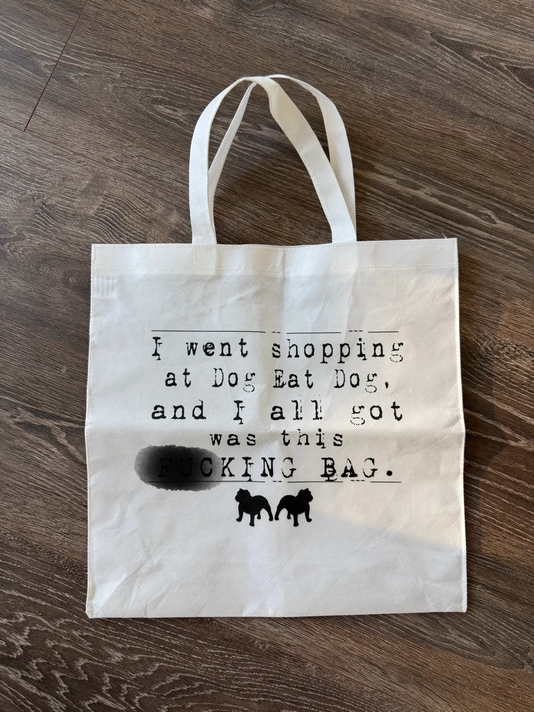 Picture edited and bad word blocked out. I'm selling a tote bag with a unique design from Dog Eat Dog. It says, "I went shopping at Dog Eat Dog, and I all got was this BAG." It's in great condition and ready for a new home!