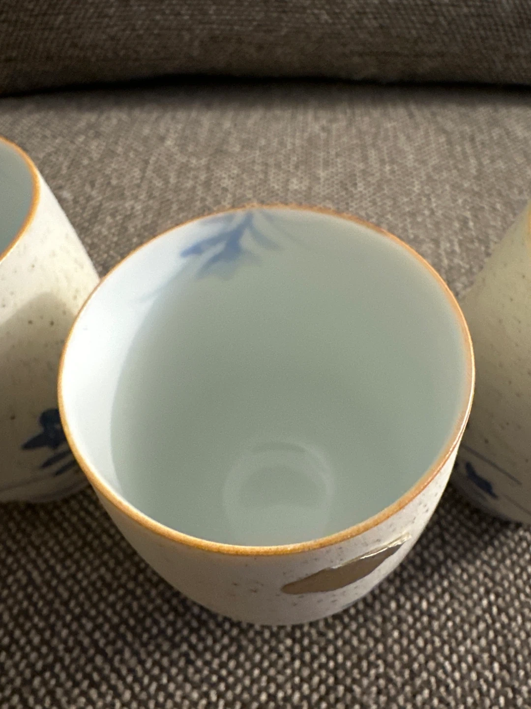 Selling a set of three Japanese tea cups. They feature a beautiful blue floral design. One of the cups has a chip on the side, as pictured.