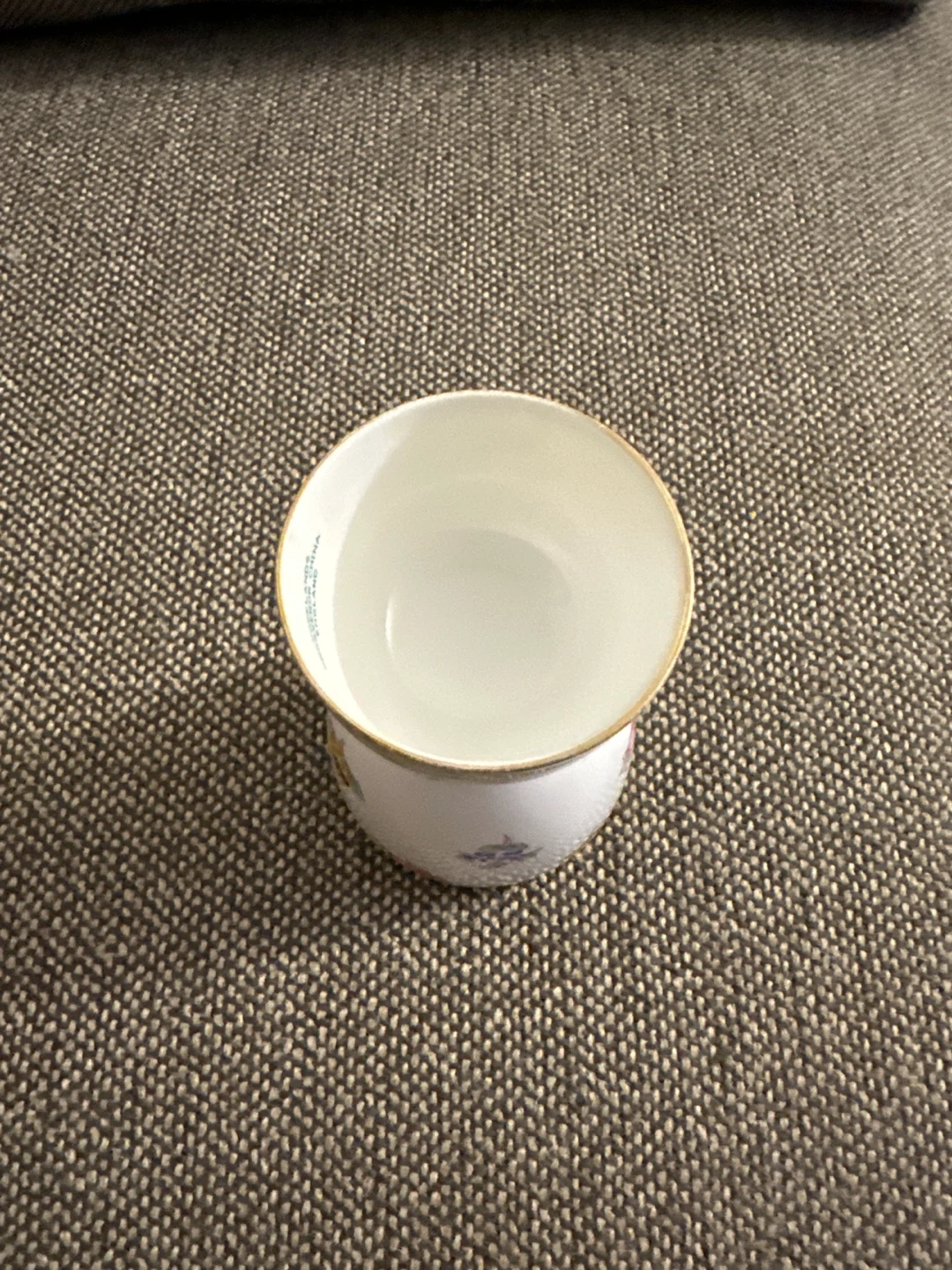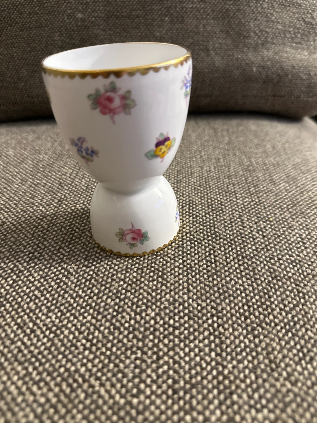 This is a charming vintage egg cup. It features a delicate floral design with roses and other small flowers, accented with gold trim. It's a lovely piece for your breakfast table or a unique addition to a collection!