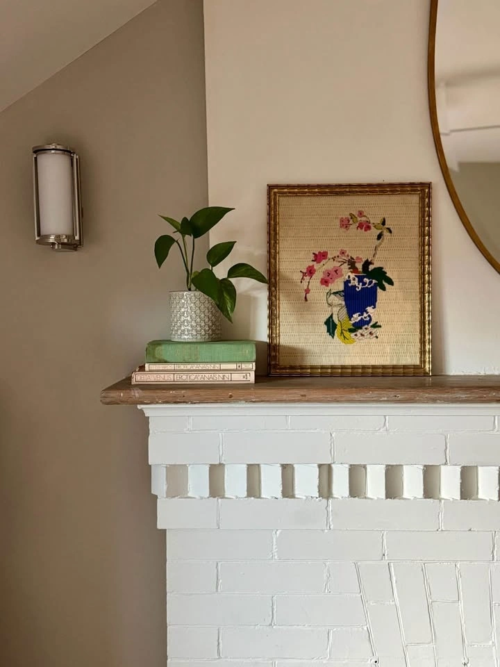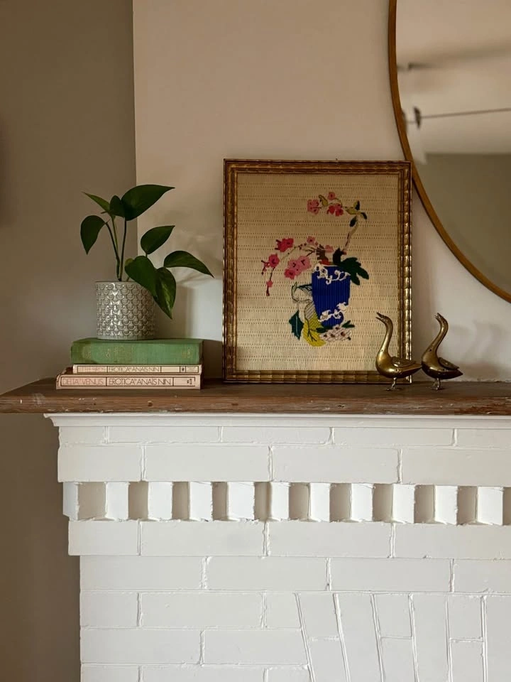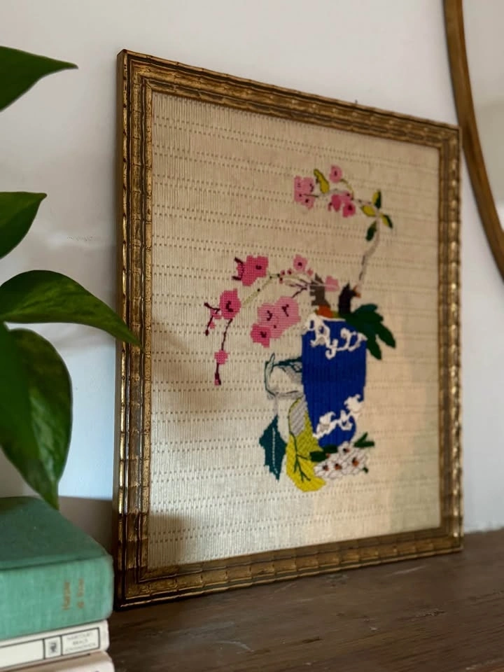 Beautiful vintage framed floral cherry blossom needlepoint. Hand-stitched artwork features a colourful bouquet in a vase with pink, blue, and yellow threads. The piece is set in a classic, petite gold-tone wood frame.