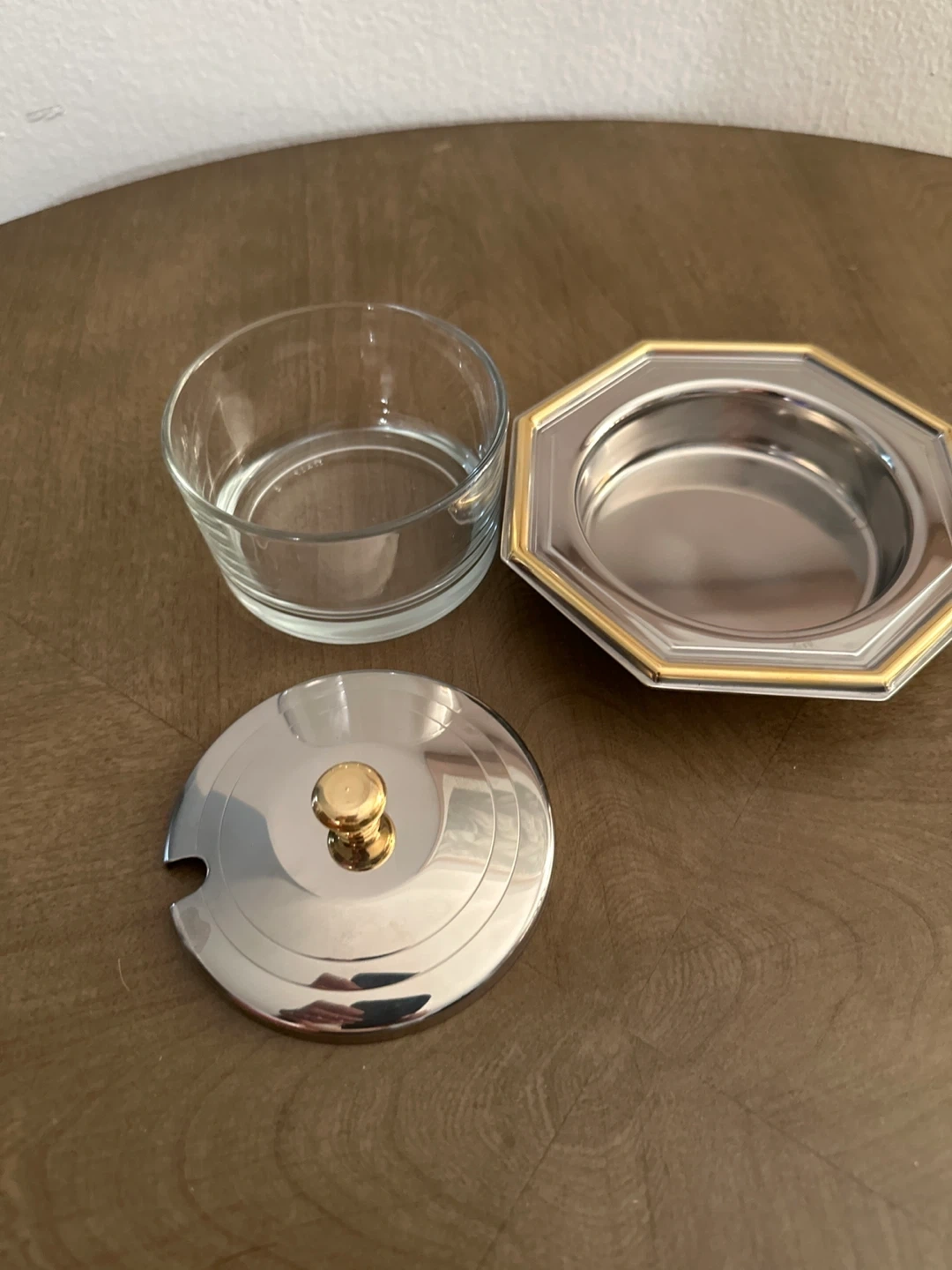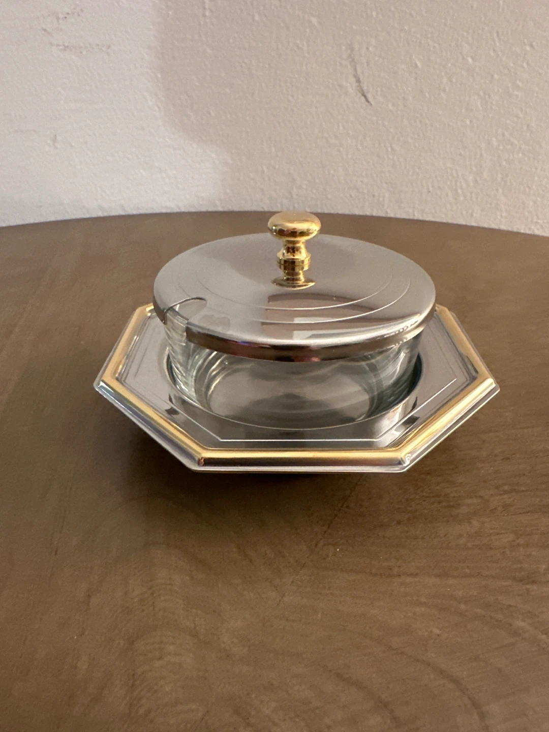 Selling a jam or sugar bowl with a lid and tray. It's in great condition and ready to find a new home! The set features a glass bowl, a stainless steel lid with a gold-colored knob, and a matching tray with gold trim