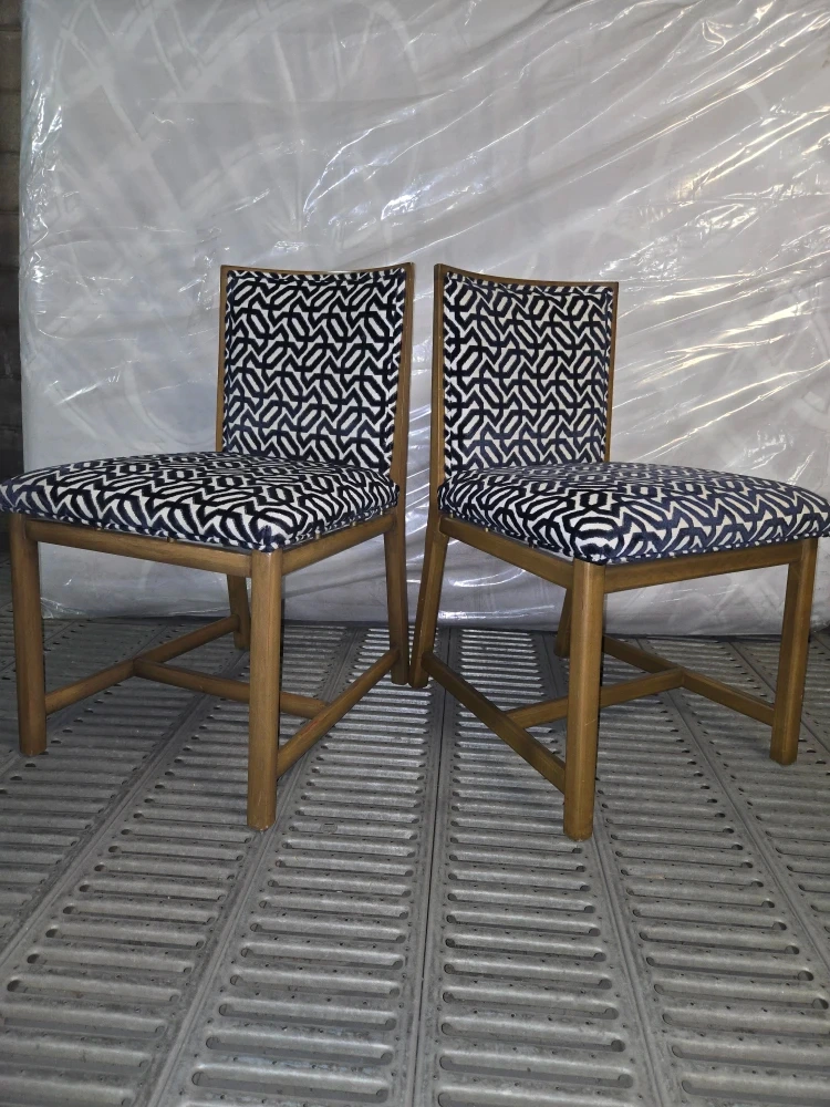 Selling a set of two dining chairs. They have a unique black and white patterned fabric on the seat and backrest, with wooden frames. They're in good condition and would look great in any dining room or kitchen!