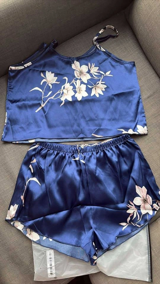 Selling a cute satin cami and shorts pajama set! It's a beautiful royal blue with a floral pattern. The material is 95% polyester and 5% elastane. Size is small. Neckline is spaghetti strap, original purchase price from Shein was CA$6.56