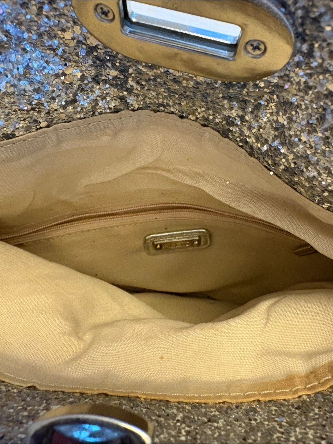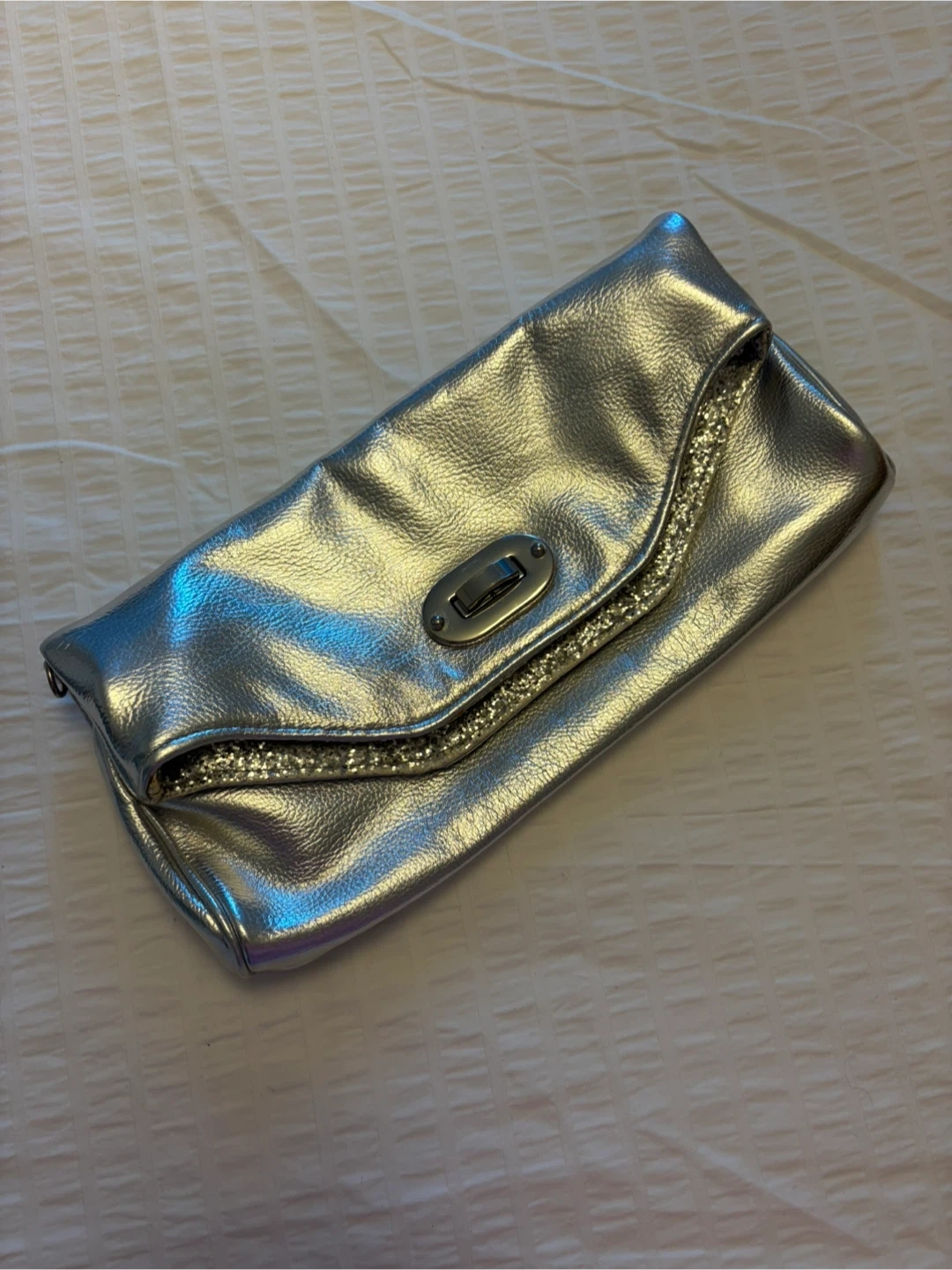 Selling a cute silver clutch! It's in great condition and perfect for a night out or special occasion. The interior is lined with a soft beige fabric and has a small zippered pocket for extra storage. It's a stylish and compact accessory to complete your look