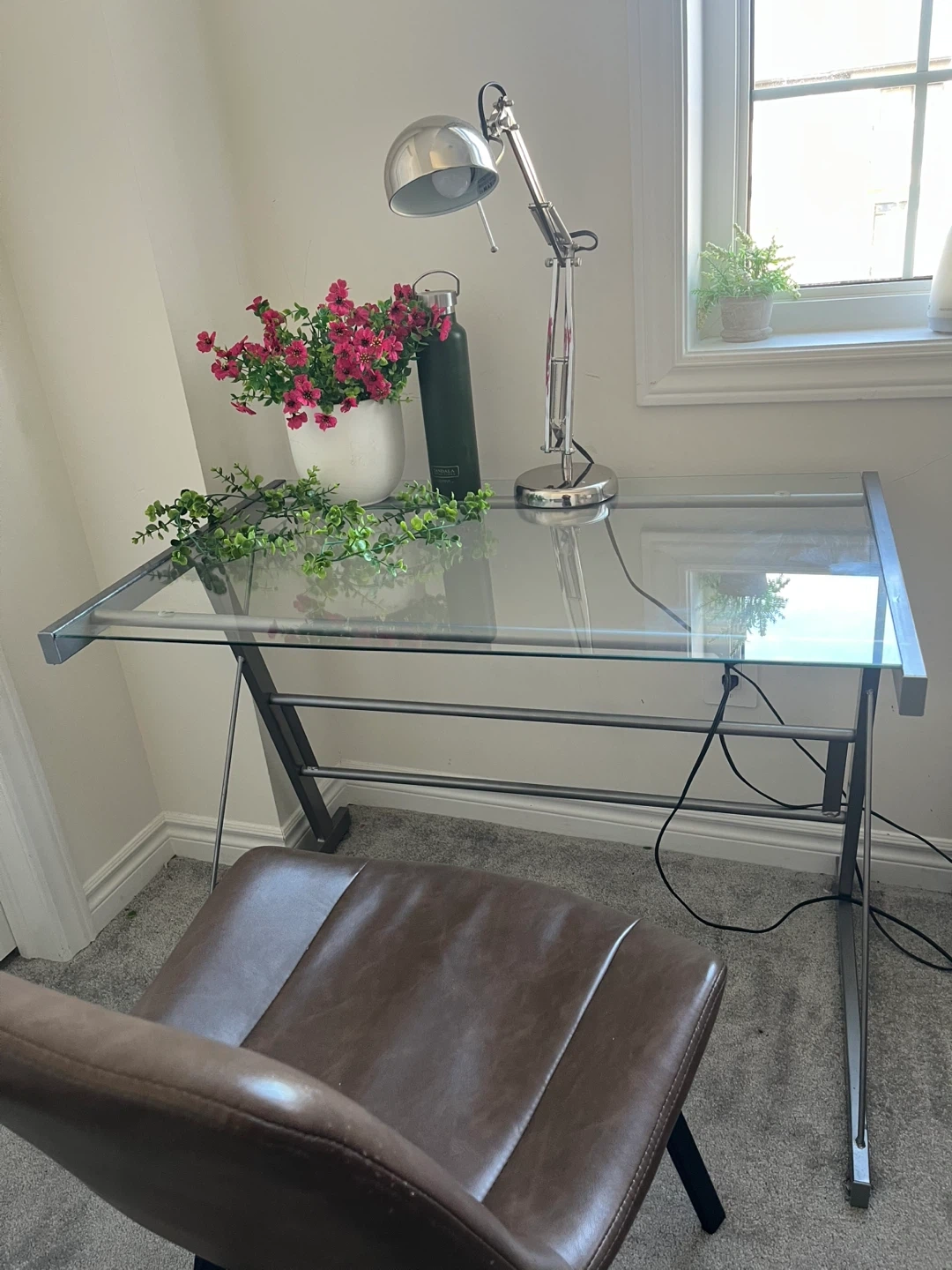 Selling a glass top desk with a metal frame. Also includes a brown faux leather stool. Both are in good condition and would be perfect for a home office or student