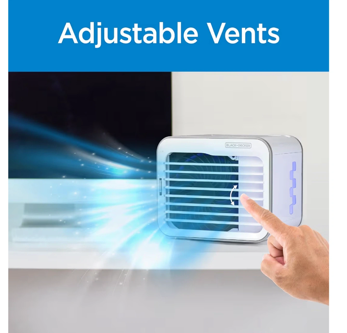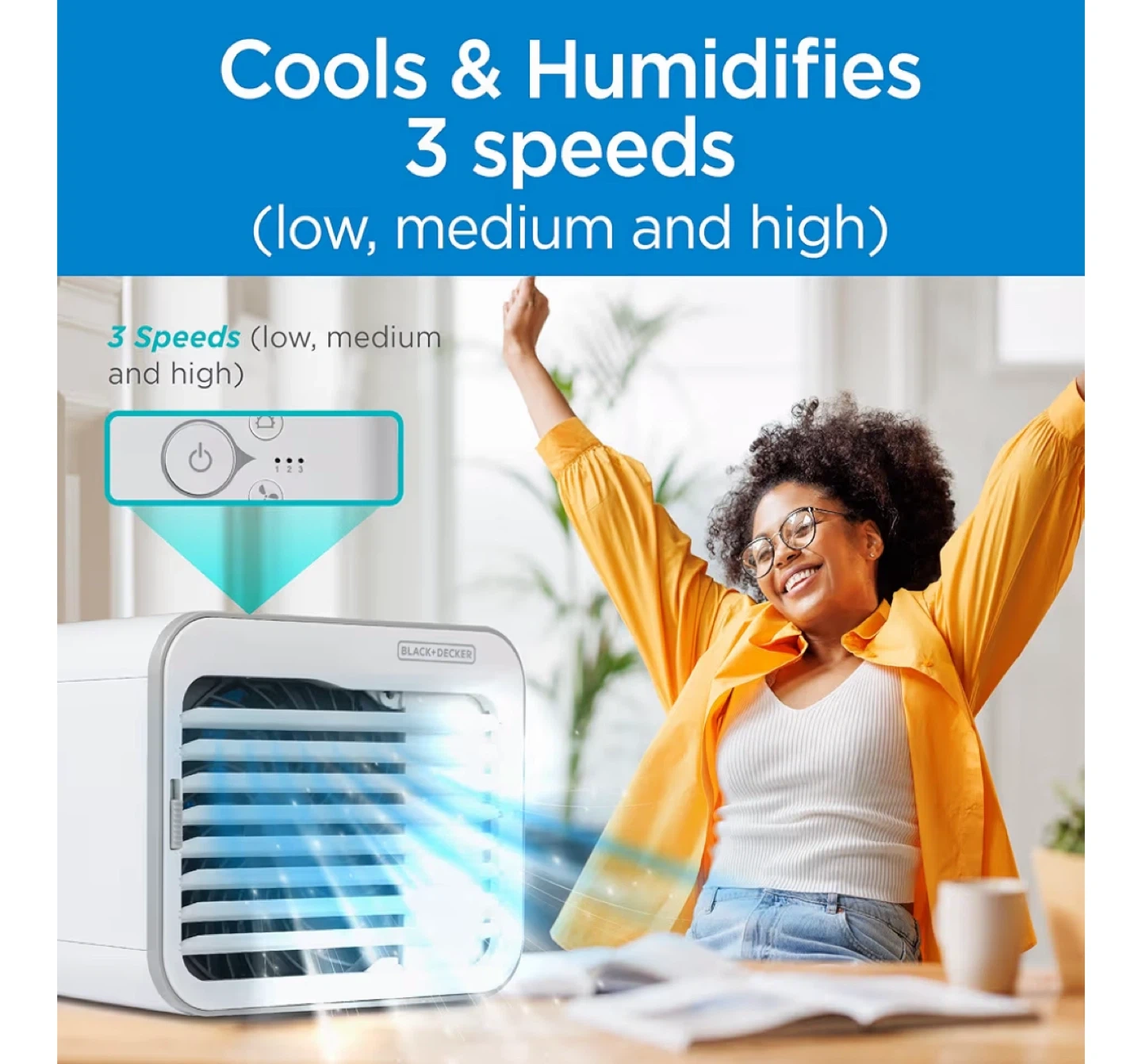 Keep cool with this Black+Decker desktop air cooler! It cools and humidifies, offering 3 speeds (low, medium, and high). It features a transparent 450 ml water tank and runs for up to 8 hours per fill. The cooler also has adjustable vents and non-skid grips. The box is included!