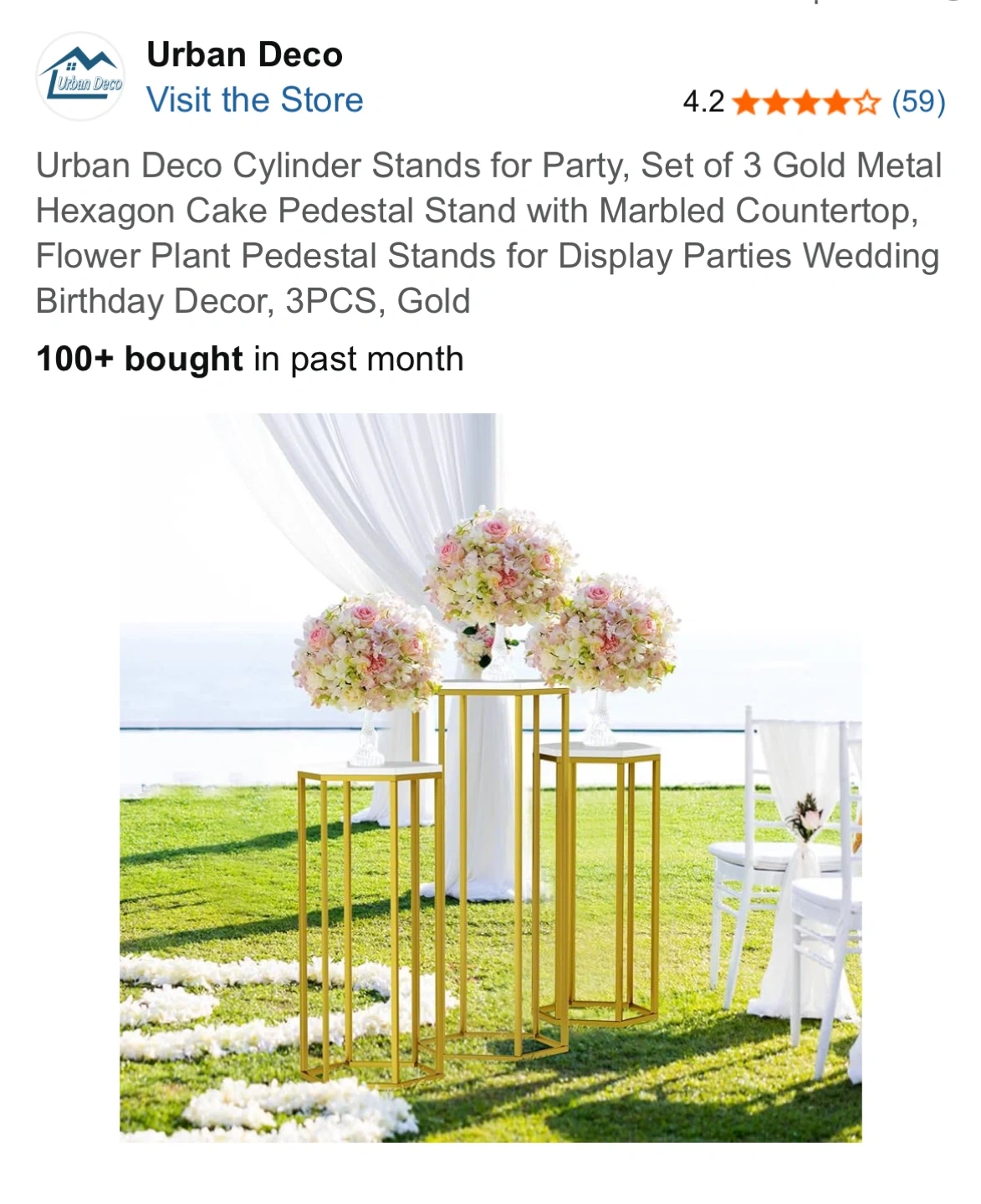 Selling a set of 3 gold metal hexagon cake pedestal stands from Urban Deco! These stands have a marbled countertop and can be used for parties, weddings, or as flower plant pedestal stands for display. The set includes three stands of varying heights: 23.6in/60cm, 27.6in/70cm, and 35.43in/90cm. They are easy to assemble in just 15 minutes!