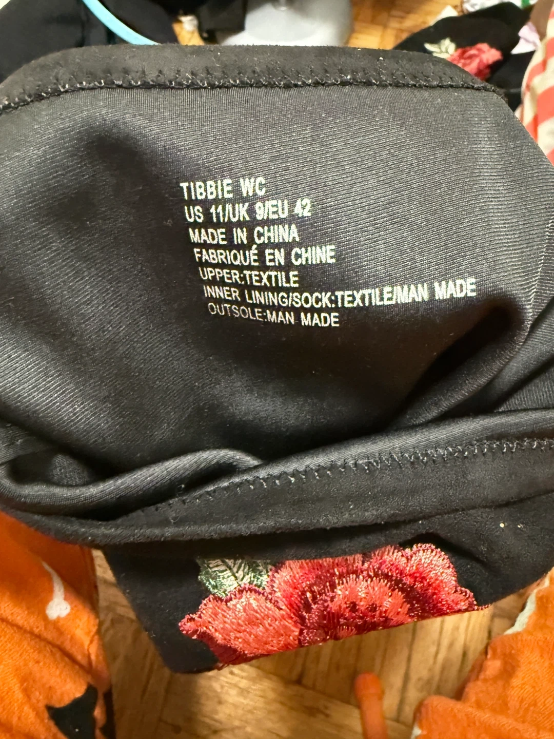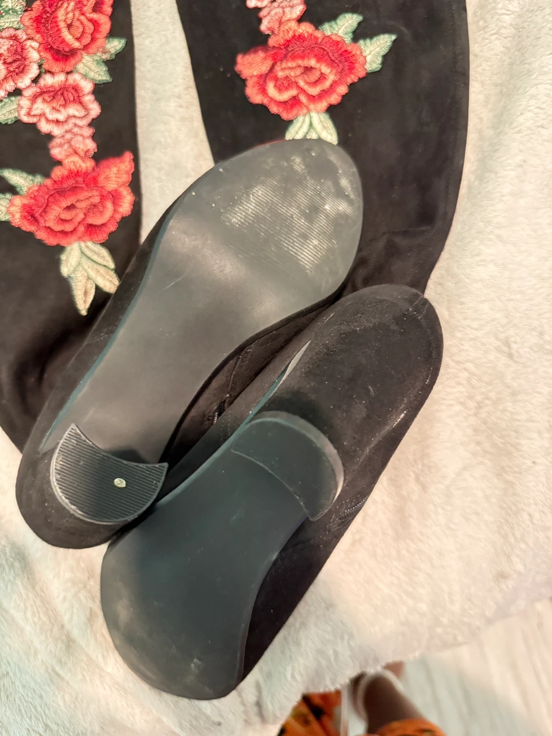 Selling a pair of TIBBIE WC over-the-knee boots in black. They feature a beautiful floral design. The size is US 11 / UK 9 / EU 42. The upper material is textile, with man-made inner lining, sock, and outsole.