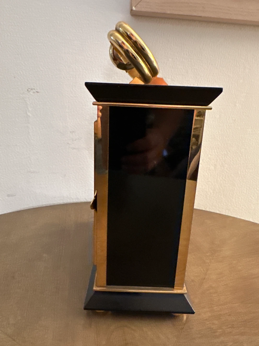 Selling a beautiful Luxor table clock. It features a black and gold design with a handle on top. The clock face has Roman numerals and ornate detailing. Perfect for adding a touch of elegance to any room!