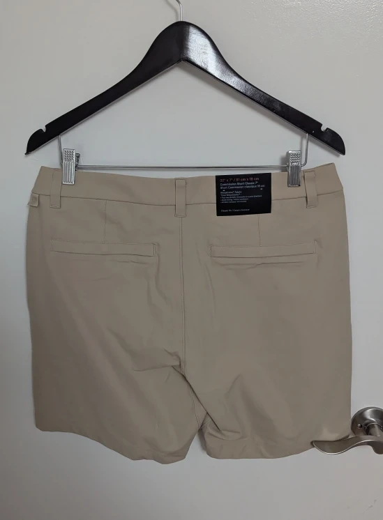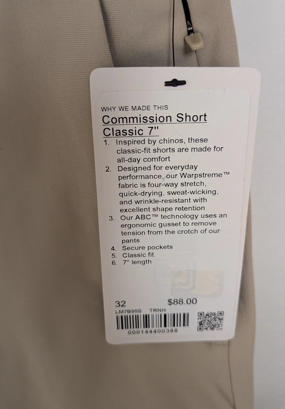 Lululemon Commission Shorts Classic 7" in size 32. These shorts are designed for all-day comfort. They are made with Warpstreme fabric, which is four-way stretch, quick-drying, sweat-wicking, and wrinkle-resistant. The ABC technology uses an ergonomic gusset to remove tension. They also have secure pockets and a classic fit. Originally bought for $88.00