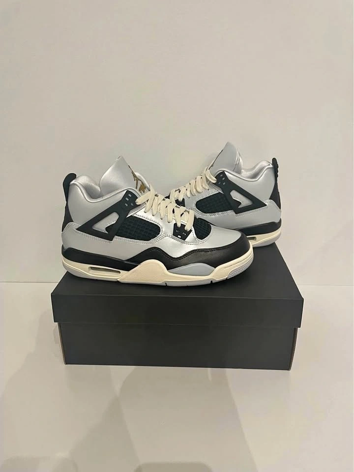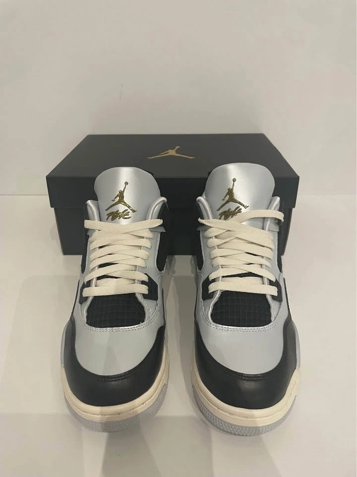 Air Jordan 4 Retro 'Pure Platinum/Metallic Gold' - This shoe features a pure platinum and metallic gold colorway, with a visible air unit and plastic lace tips. It was released in 2016 and is a highly sought-after sneaker among Jordan enthusiasts.