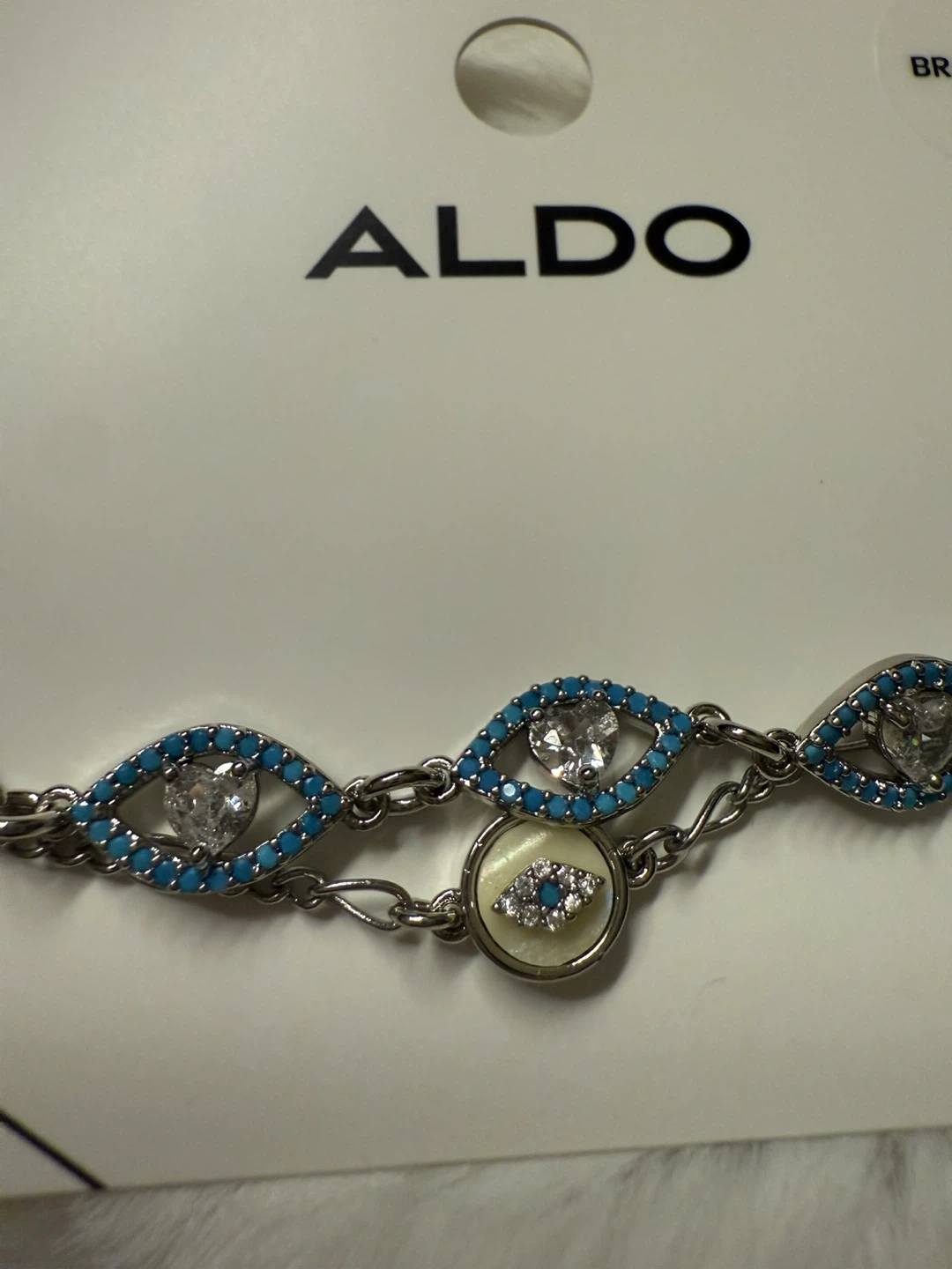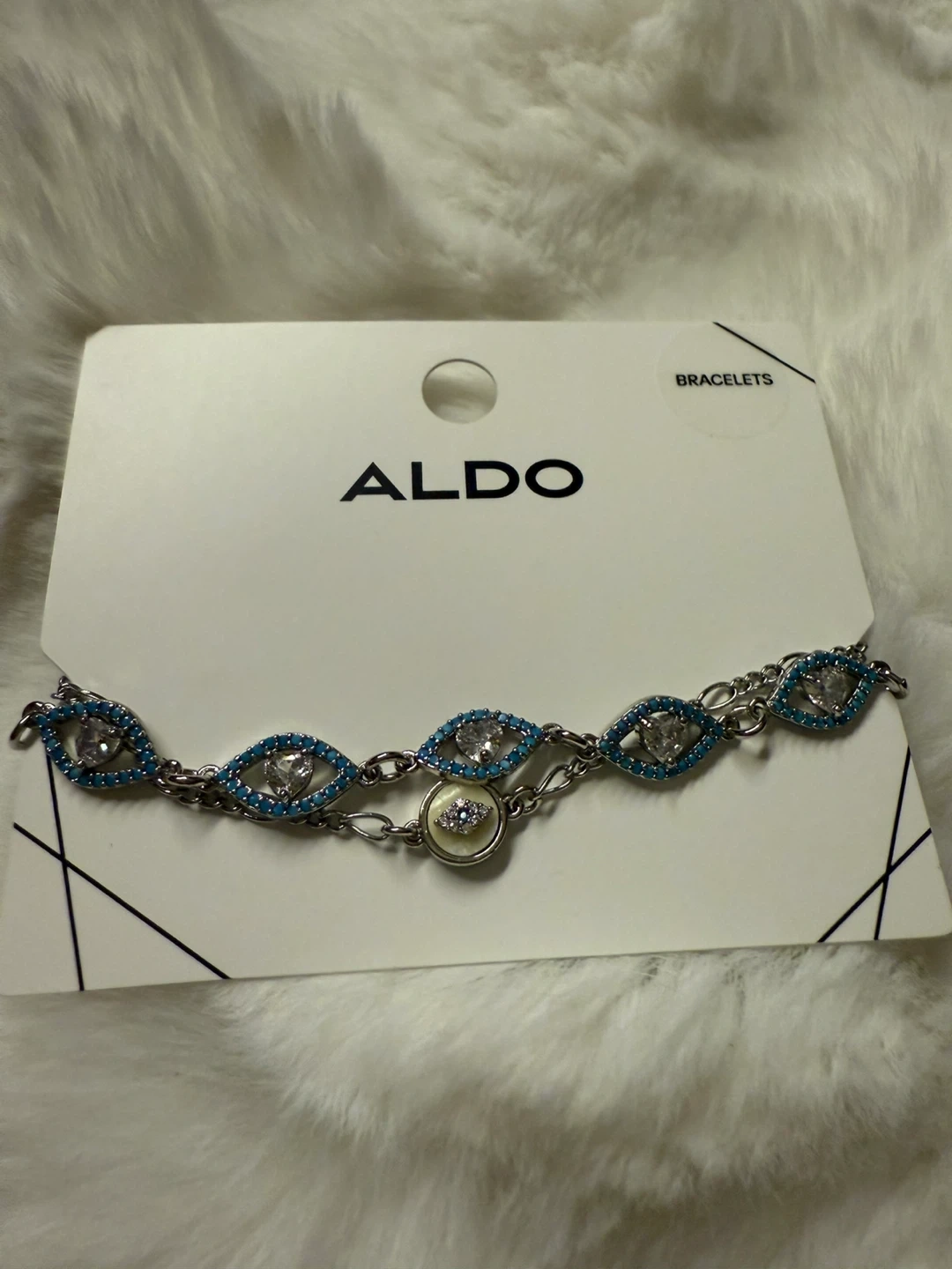 This is a brand new Aldo 'Blissfully-440' bracelet! It features a silver chain with turquoise and crystal eye charms. The original price was $28.00 CAD. It's one size fits all.
