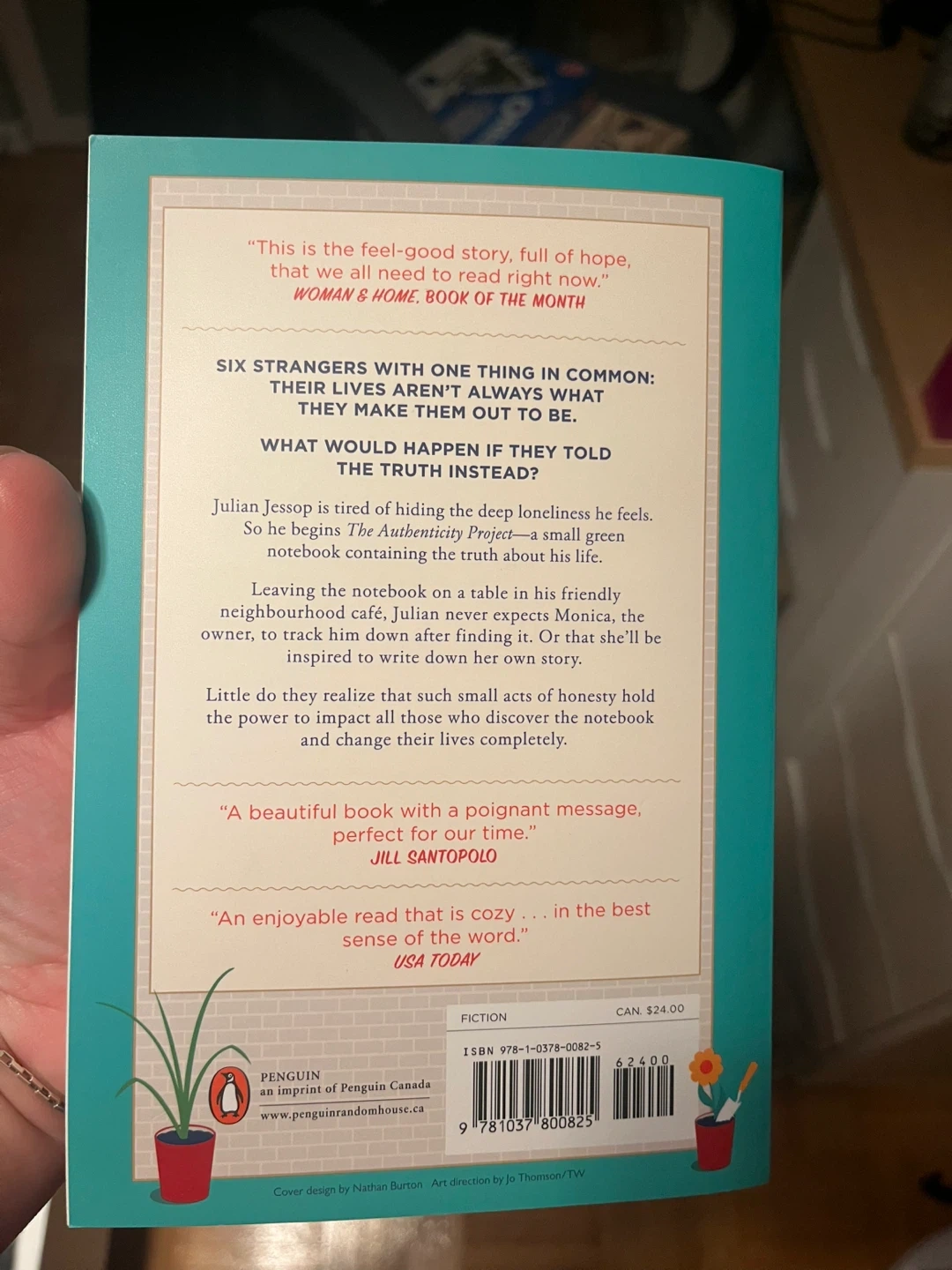 Selling "The Authenticity Project" by Clare Pooley! It's a national bestseller and a feel-good story about friendship and connection. The book is about six strangers with one thing in common and what would happen if they told the truth instead. A small green notebook containing the truth about his life.