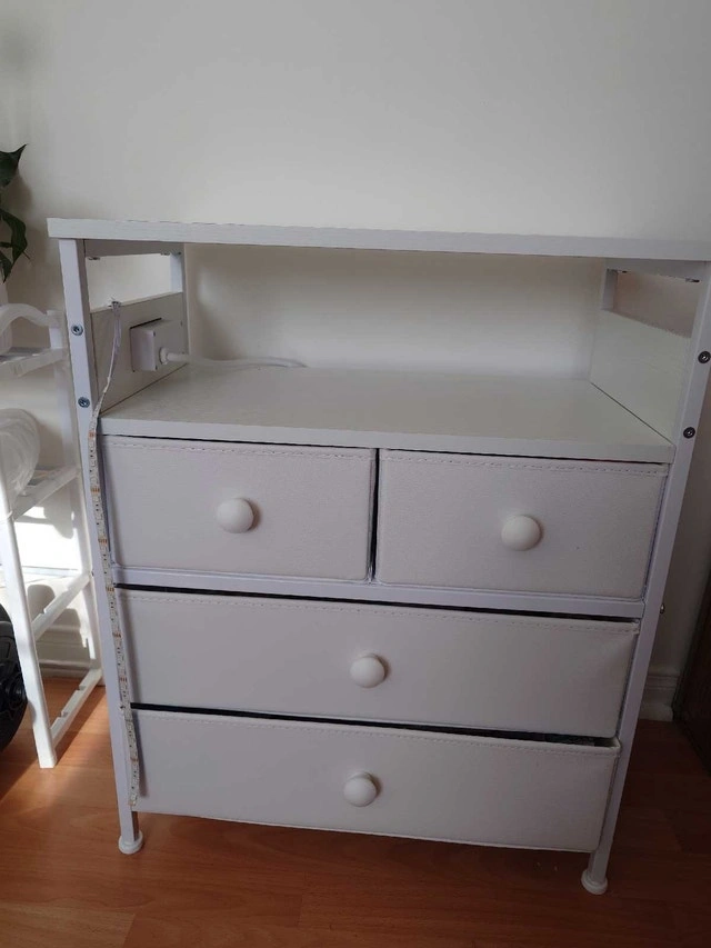 Excellent condition, comes with adjustable LED light line with remote. Measurements are 30D x 55W x 67.5H. Four drawers for ample storage. Top shelf for displaying items. White finish. Sturdy construction. Pick up only.