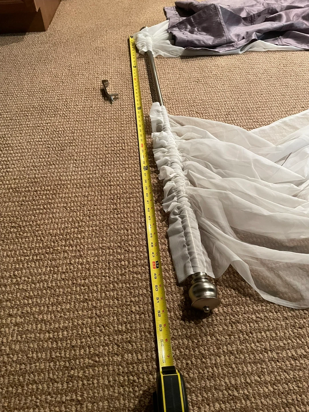 Selling a curtain rod that measures approximately 85 inches in length, along with a set of white and purple curtains.