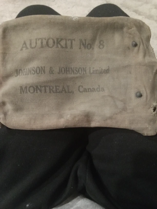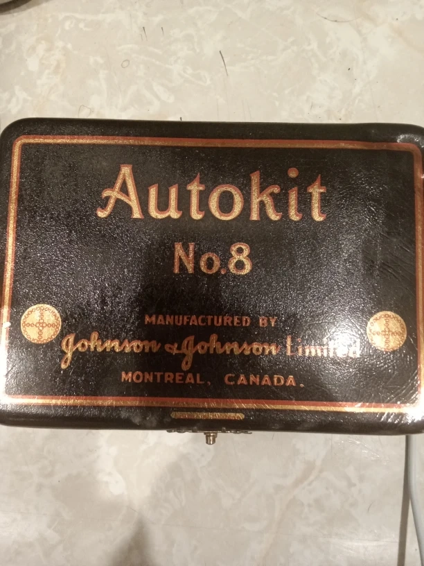 Selling a vintage 1900s Johnson & Johnson Autokit No.8. This kit includes items like adhesive tape, gauze bandages, triangular bandage, burn emollient, iodine, scissors, and wooden applicator sticks. A unique find for collectors!