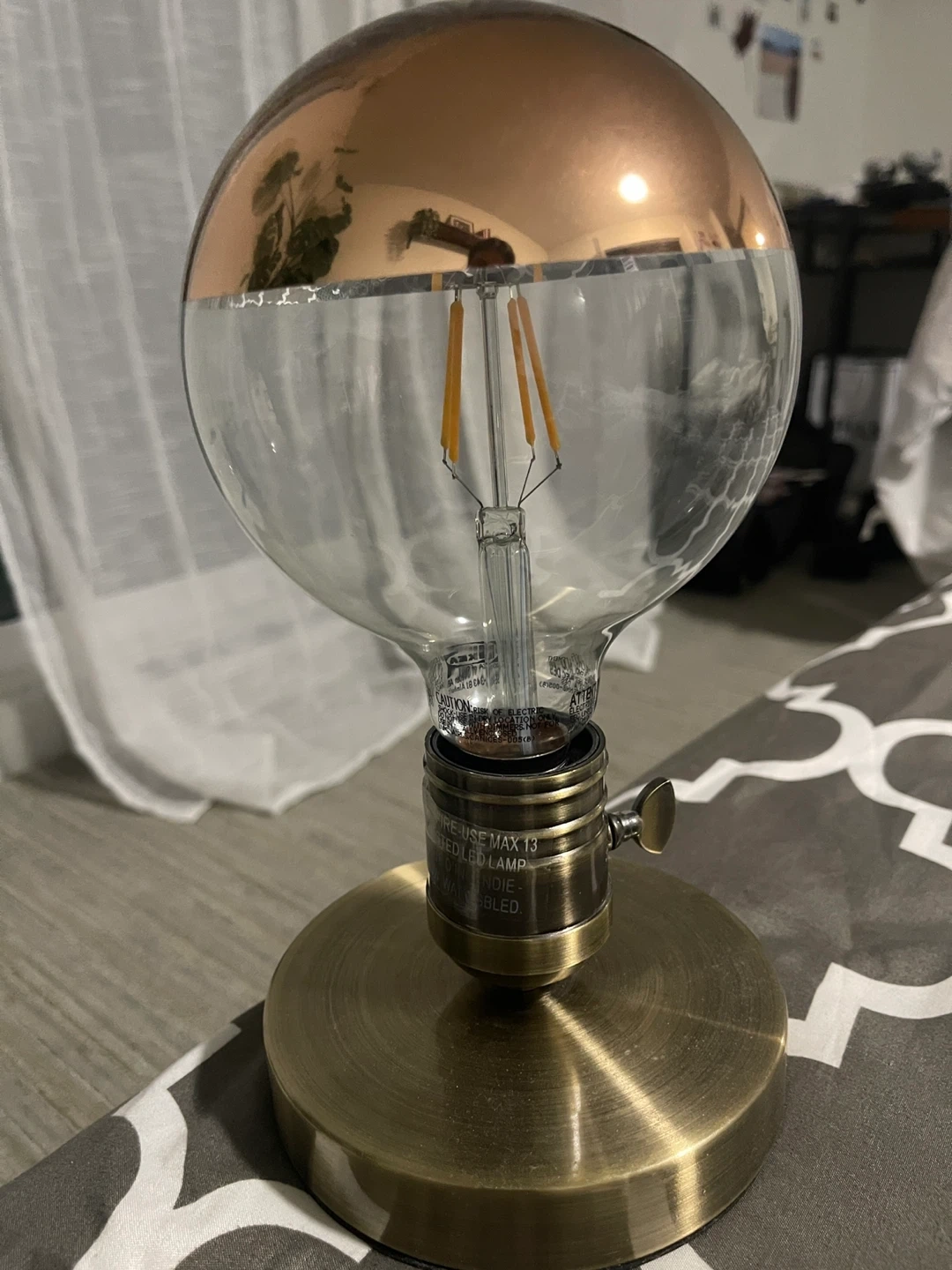 Selling a gently used IKEA Megagram table lamp! It features a stylish design with a round bulb and a bronze-coloured base. It's in great condition and would be a lovely addition to any room