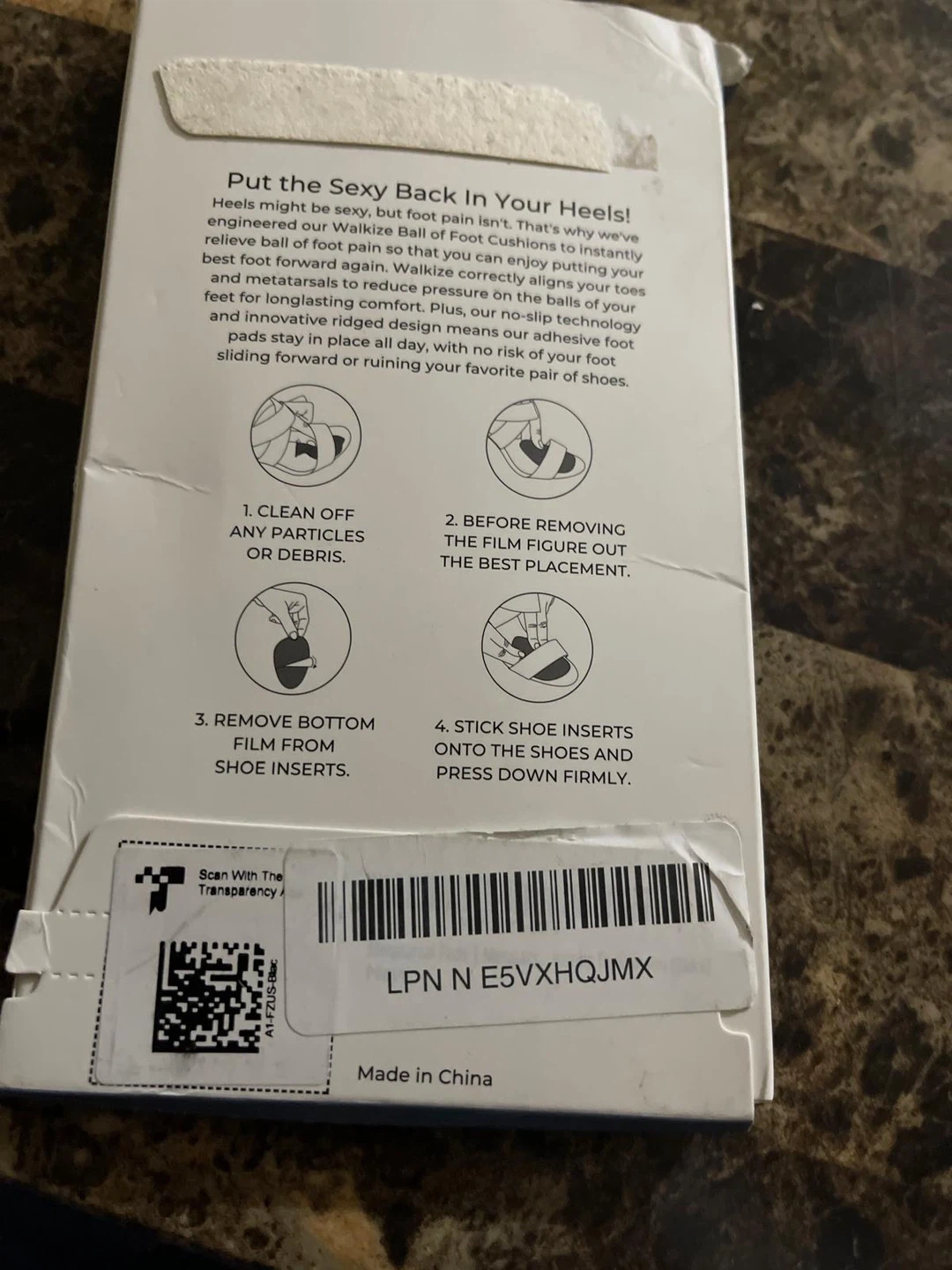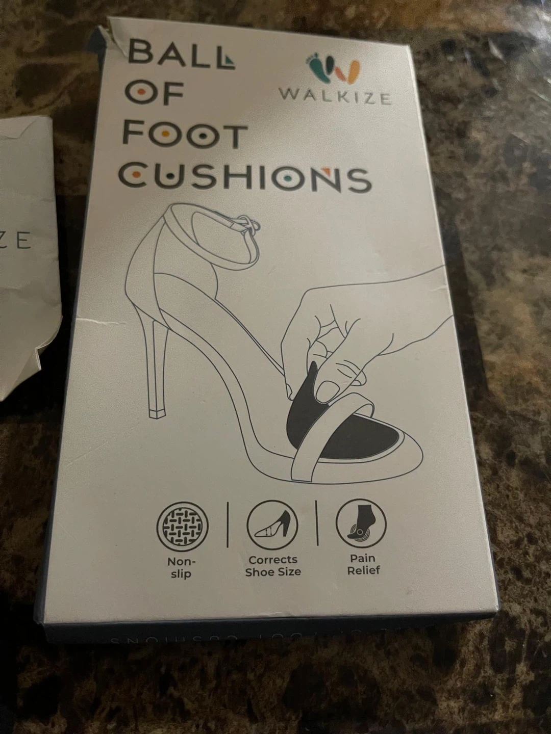 Selling a new, unopened box of Walkize Ball of Foot Cushions! These cushions are designed for pain relief, correcting shoe size, and preventing slipping. They're perfect for making your heels more comfortable.