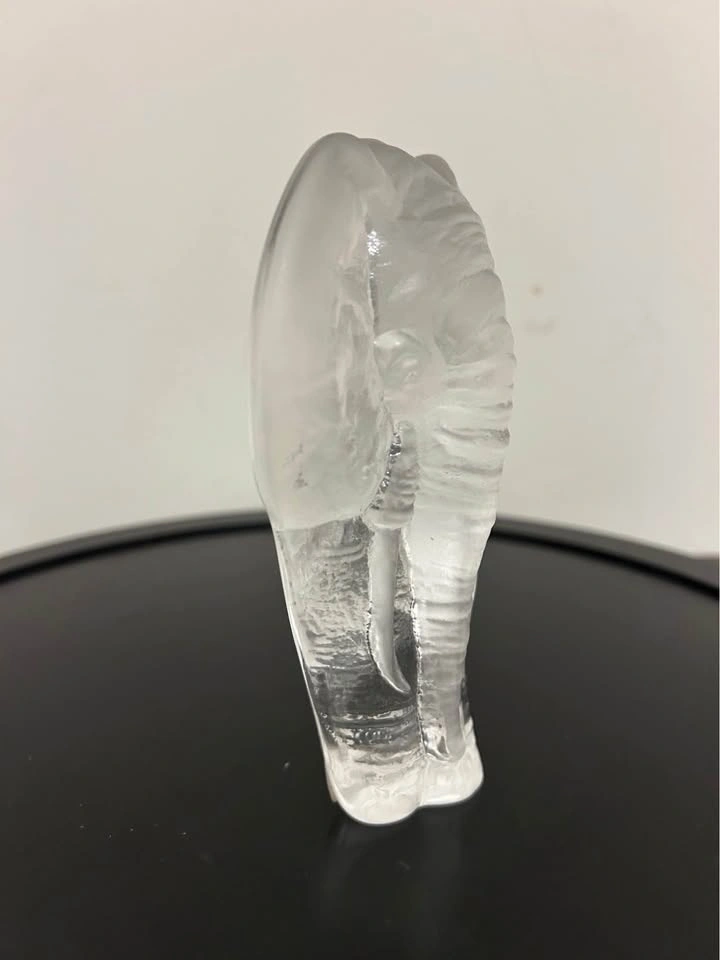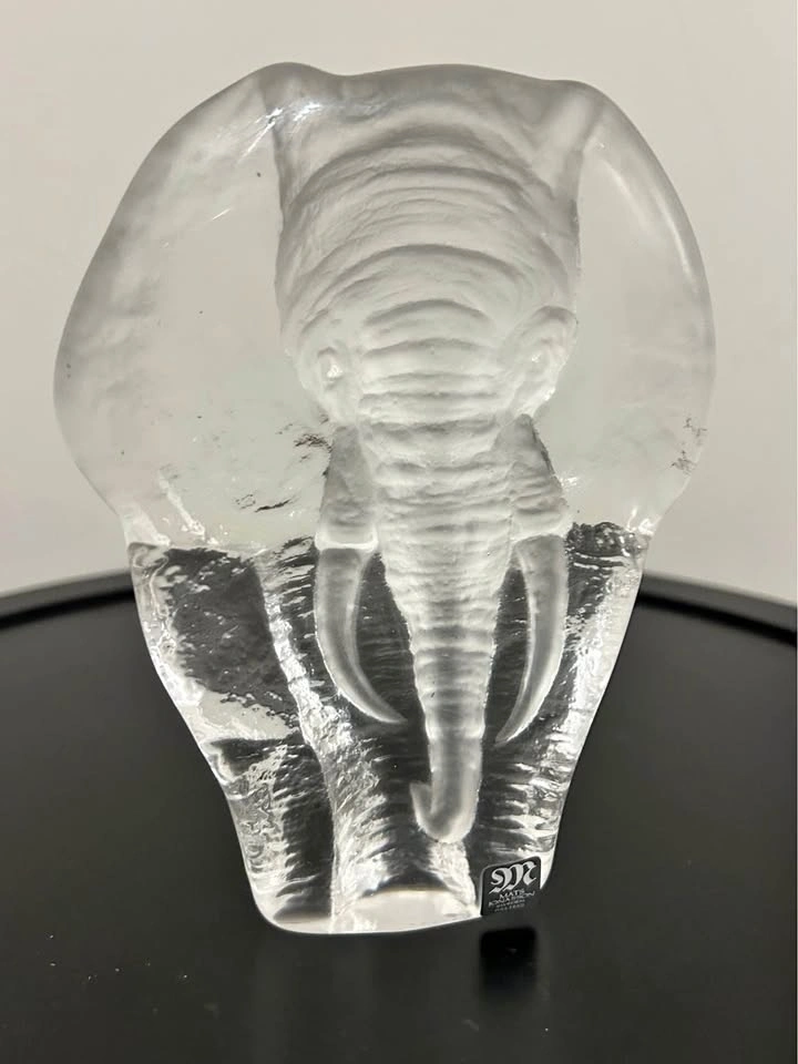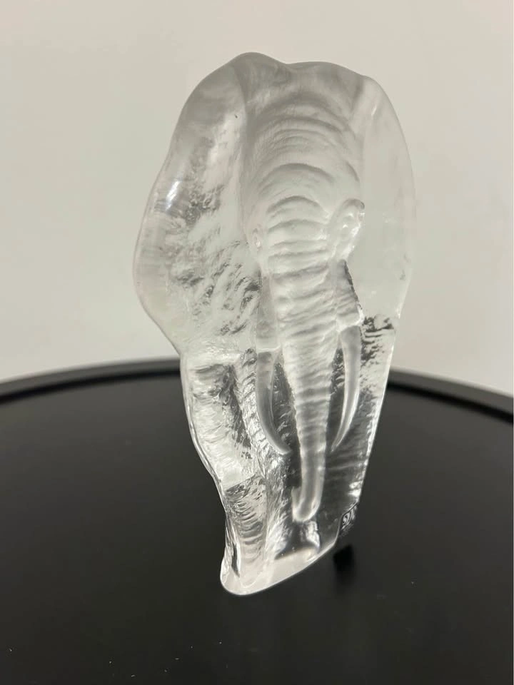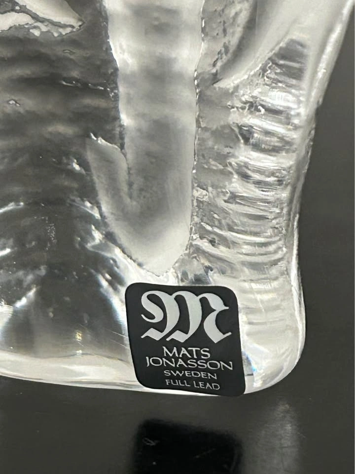 Beautiful collectible Mats Jonasson Sweden full-lead crystal sculpture featuring a detailed elephant emerging from solid clear glass. A classic Scandinavian art-glass design with rich texture and impressive depth when light passes through. Perfect for collectors of Swedish crystal or lovers of wildlife decor.