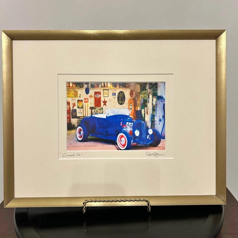 Beautiful gallery-framed automotive art print titled “Cruisin’ 32”, signed by the artist. Featuring a classic blue ’32 hot rod inside a nostalgic retro garage full of vintage oil signs and Americana decor. This piece was professionally framed by Michaels and comes from Eclectic Image Gallery (Santa Fe / Sedona / Maui), known for high-quality collectible prints. A perfect decor piece for a man cave, garage, studio, barbershop, car enthusiast office, or vintage-style interior. • Gallery-quality framed print • Signed artwork • Hot rod / Americana / automotive theme • Ready to hang Pick up: Seton area, Calgary. See also my other lots. Open to your questions and suggestions. If necessary, I provide additional photos. These are not new things, so please look carefully at the photos and videos. Sizes are submitted on request and also using a tape measure in the photo. Measurements can be seen in the photos.