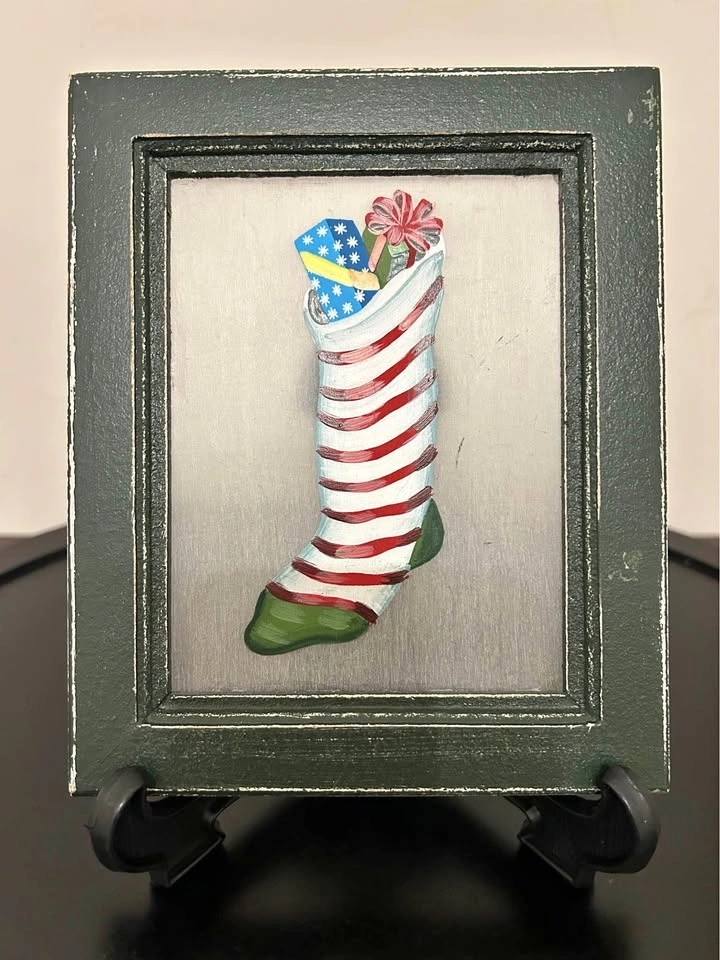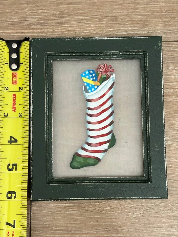 Charming hand-painted Christmas decor featuring a festive striped stocking filled with gifts. Set in a rustic green distressed frame, this piece adds a cozy, traditional holiday touch to any room. Perfect for wall display, entryway accents, or gifting. Collectible folk-art style with warm seasonal character.