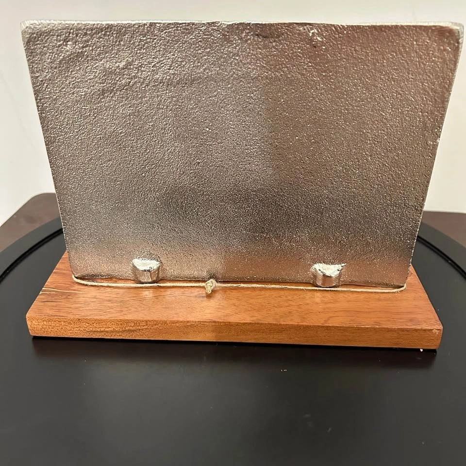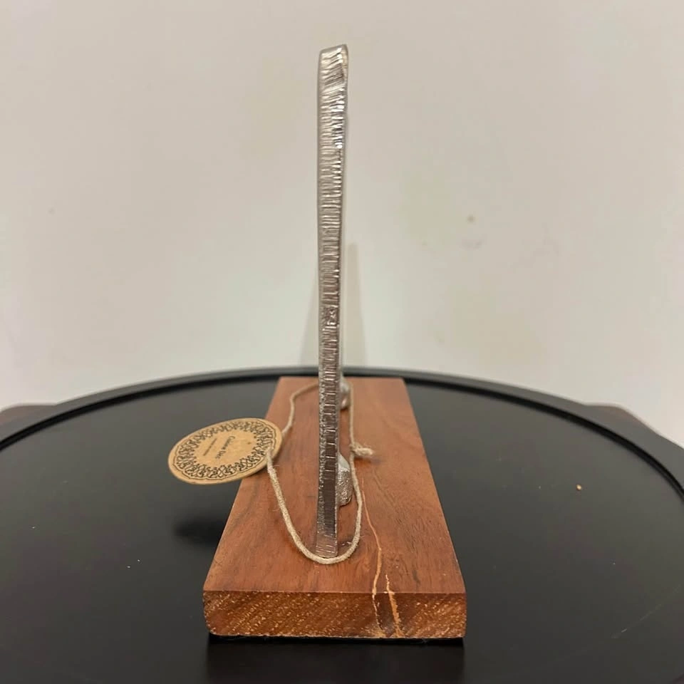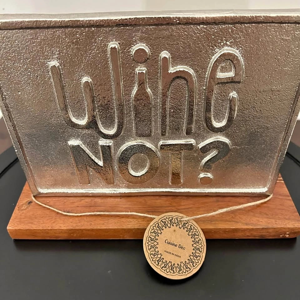 A stylish Home Bar decorative sign featuring the playful phrase “Wine Not?” in raised silver-tone metal. The textured metal plate is mounted on a solid wood base, giving it a warm and premium look. Perfect for a wine bar, kitchen bar shelf, countertop display, or gift for a wine lover. Handmade in India (Cuisine Déc).