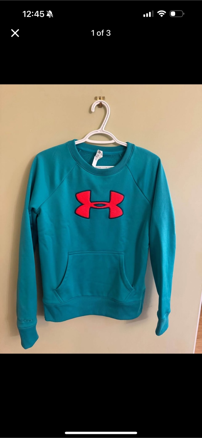 Here's a comfy Under Armour sweatshirt in a nice teal colour! It's a size small and has a handy front pocket.