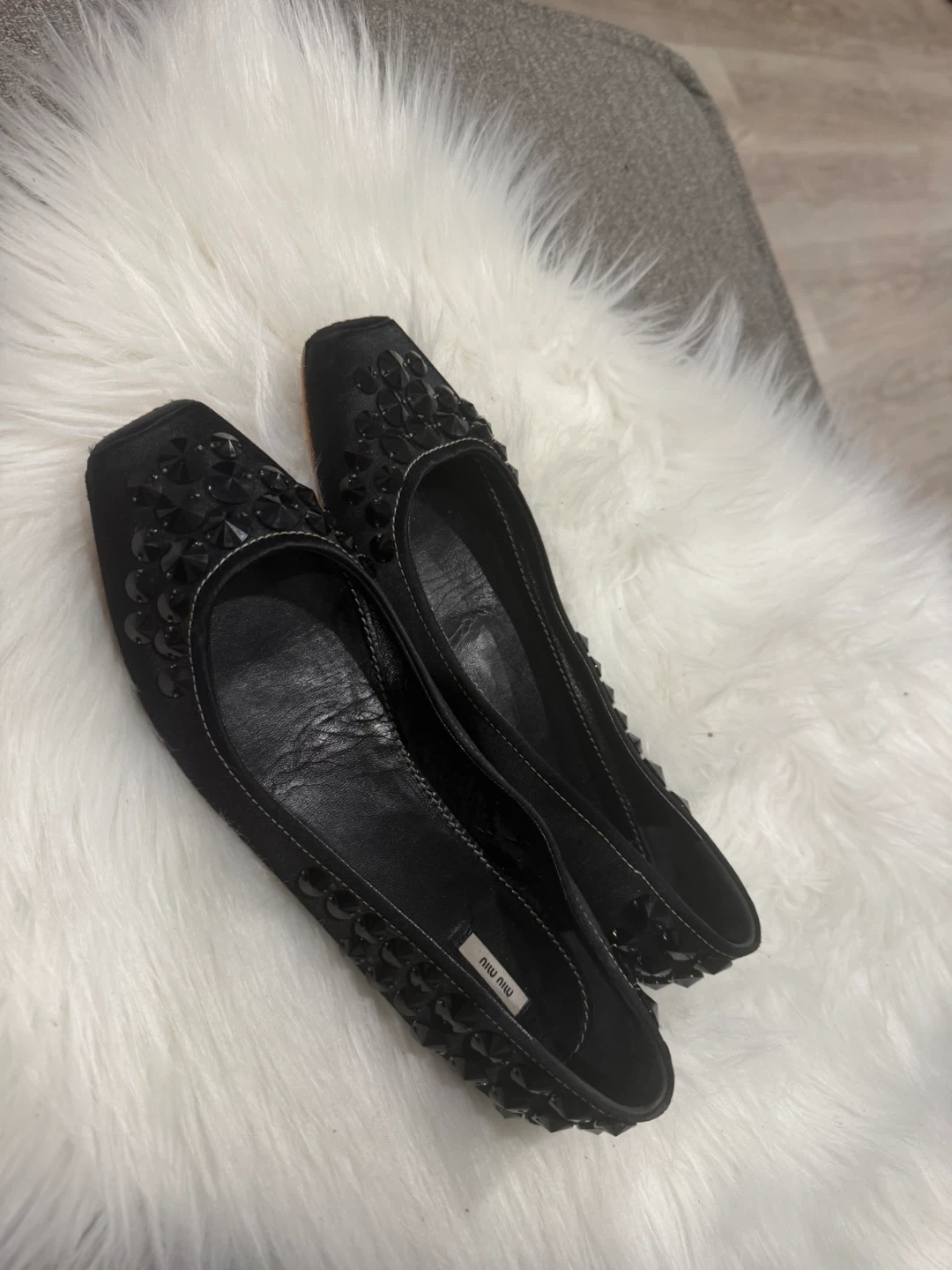 Selling a pair of Miu Miu black ballet flats. They feature a square toe and are embellished with black studs around the edges. These are perfect for adding a touch of edginess to a classic style!