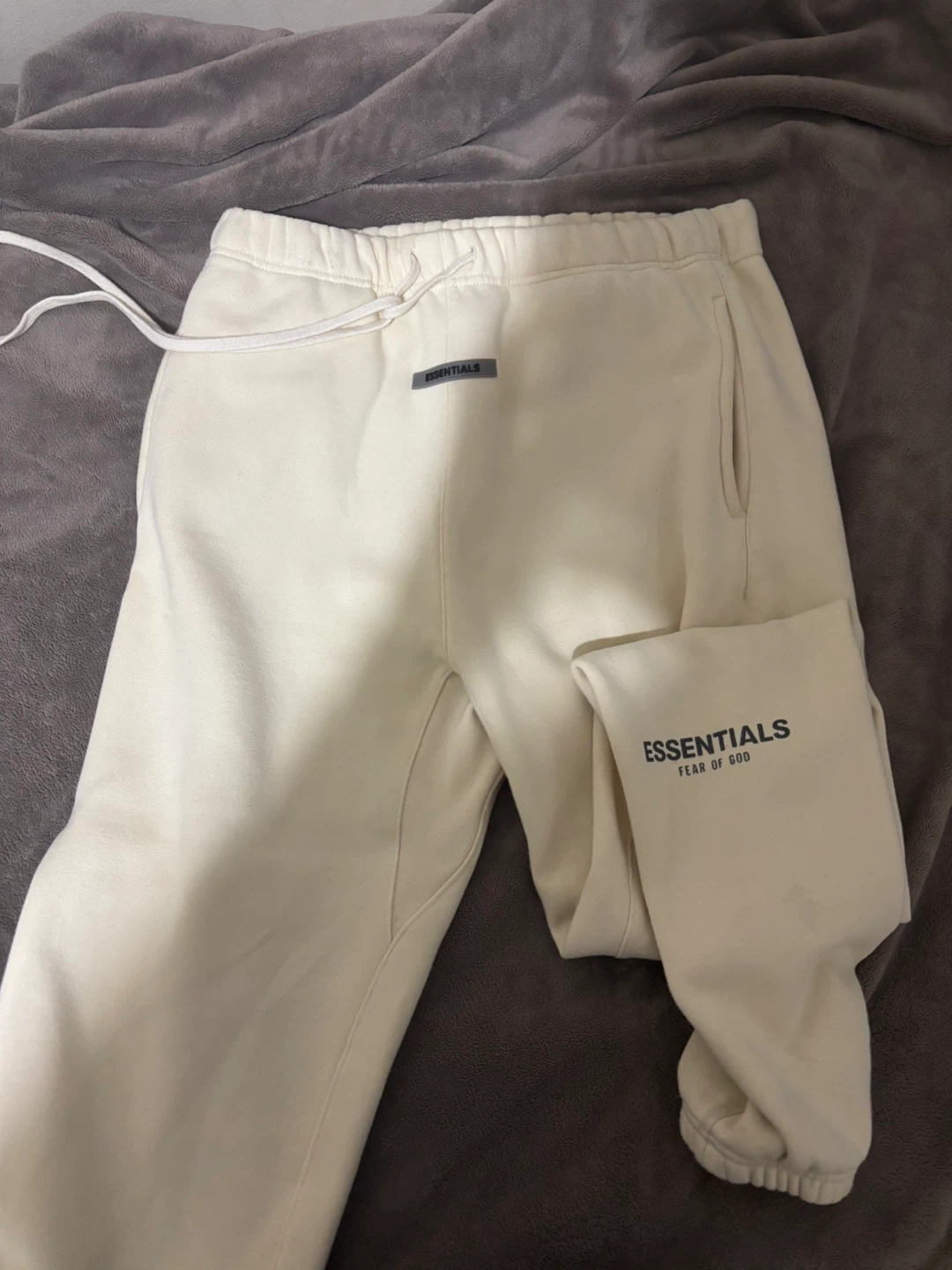 Selling a pair of Essentials Fear of God sweatpants in cream. They are in great condition and super comfy!