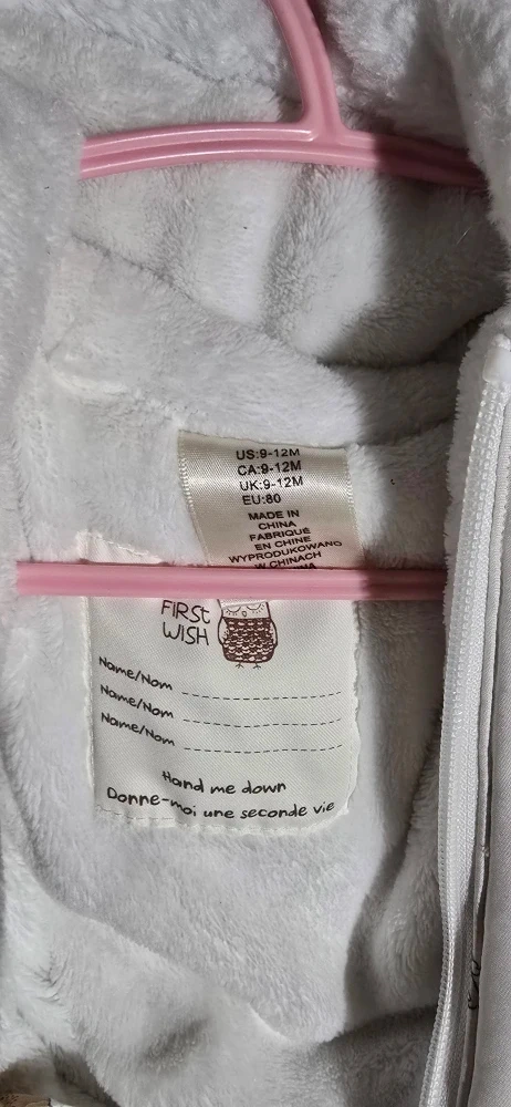 This adorable First Wish snowsuit is perfect for keeping your little one warm this winter! It's sized 9-12M and features a cute animal and tree print. It has a cozy, soft lining and a hood to protect from the elements. It's in great condition and ready for a new home!